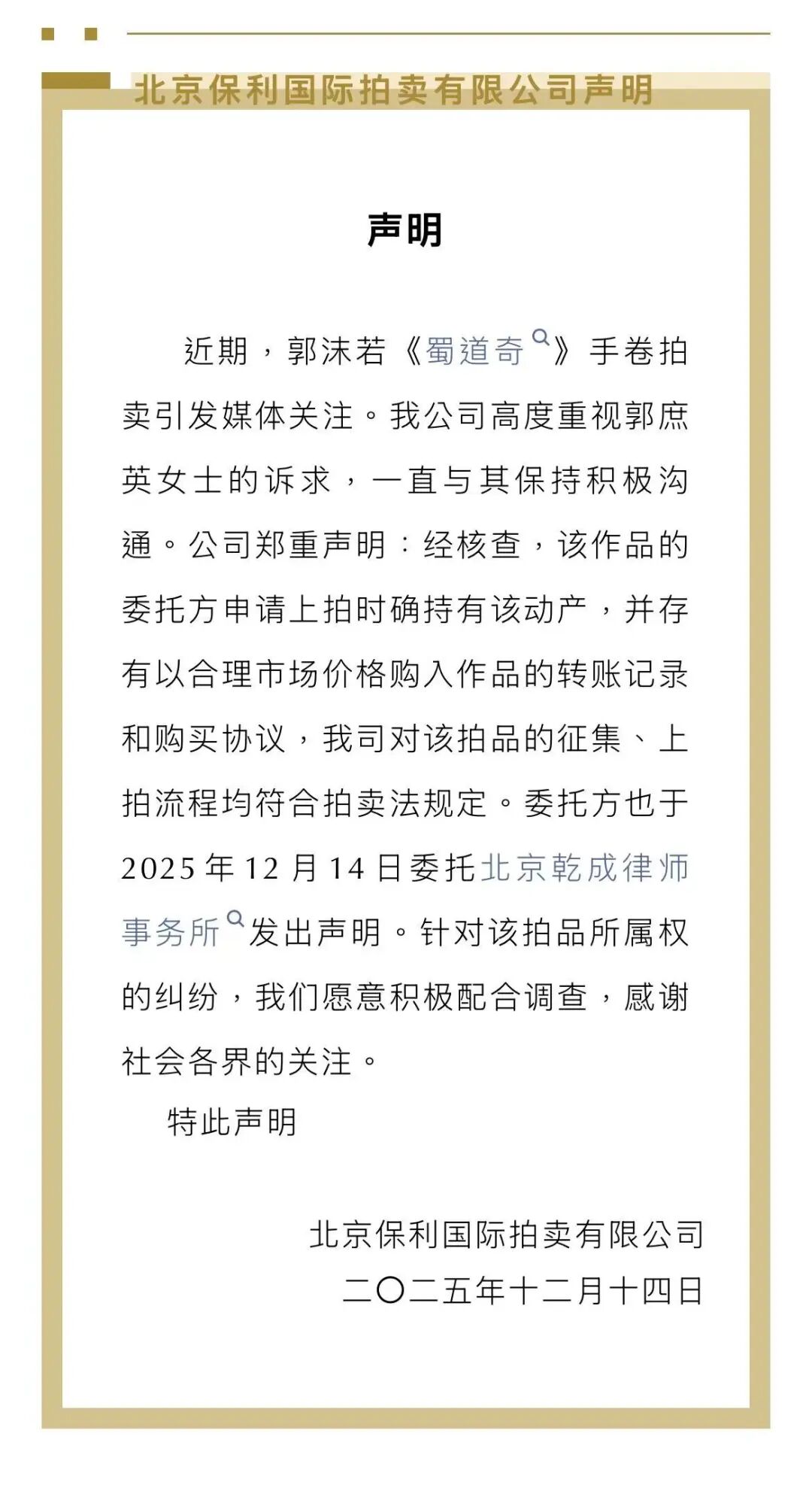 12月14日,北京保利国际拍卖有限公司发布声明: