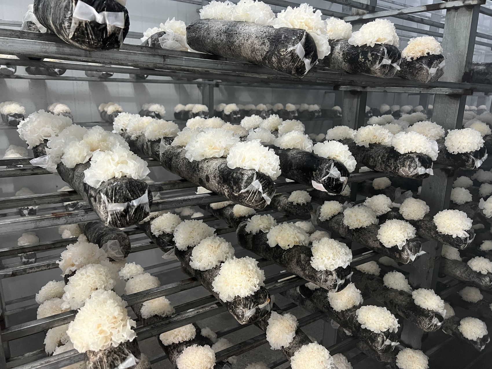 在通江未来生物科技有限公司生产车间,菌架上的一袋袋银耳等待成长盛放。