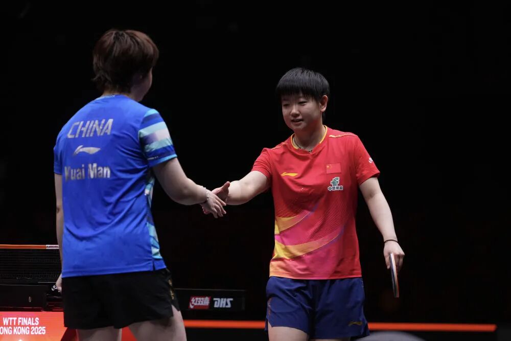 12月13日,孙颖莎(右)在比赛后与蒯曼握手致意