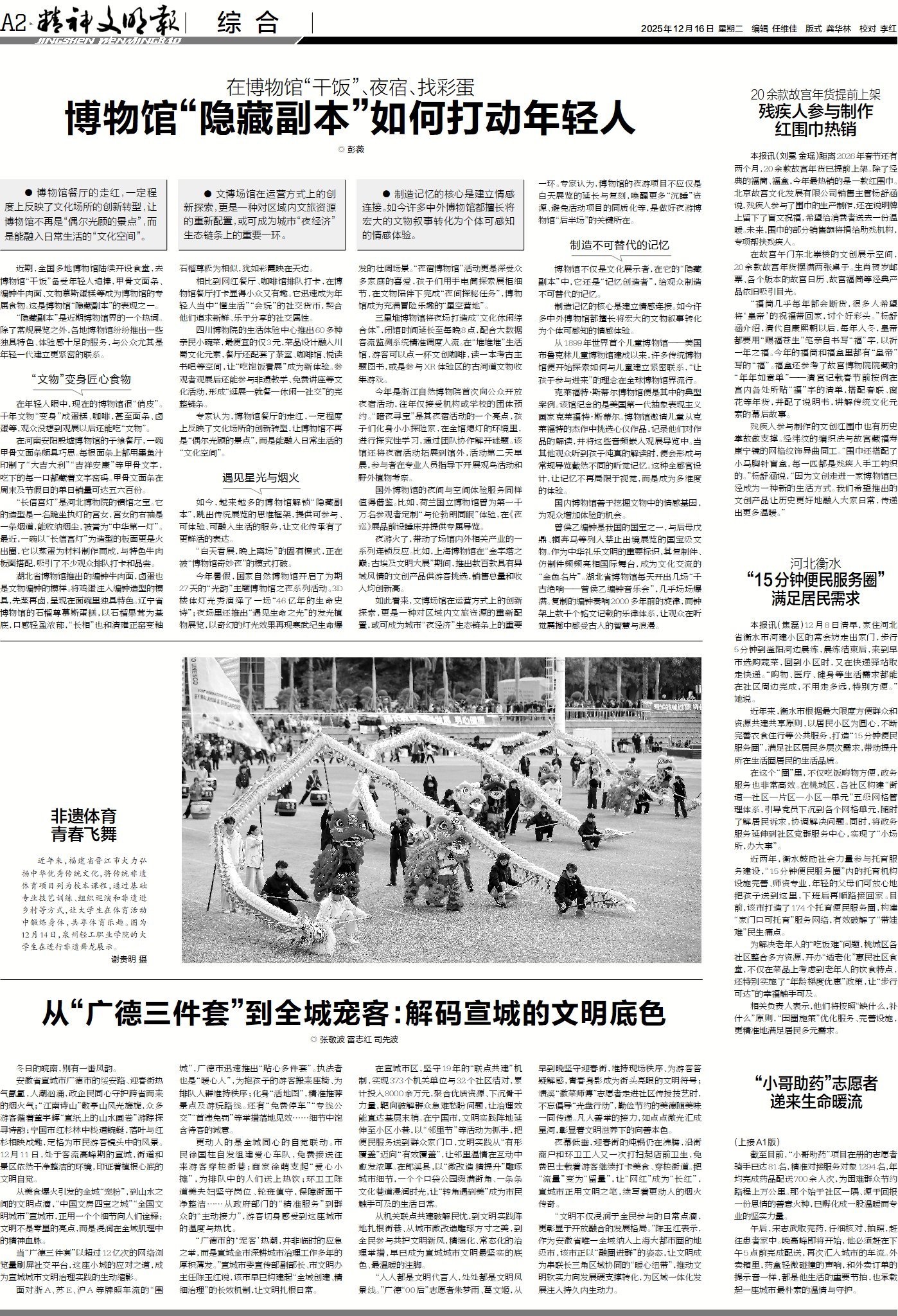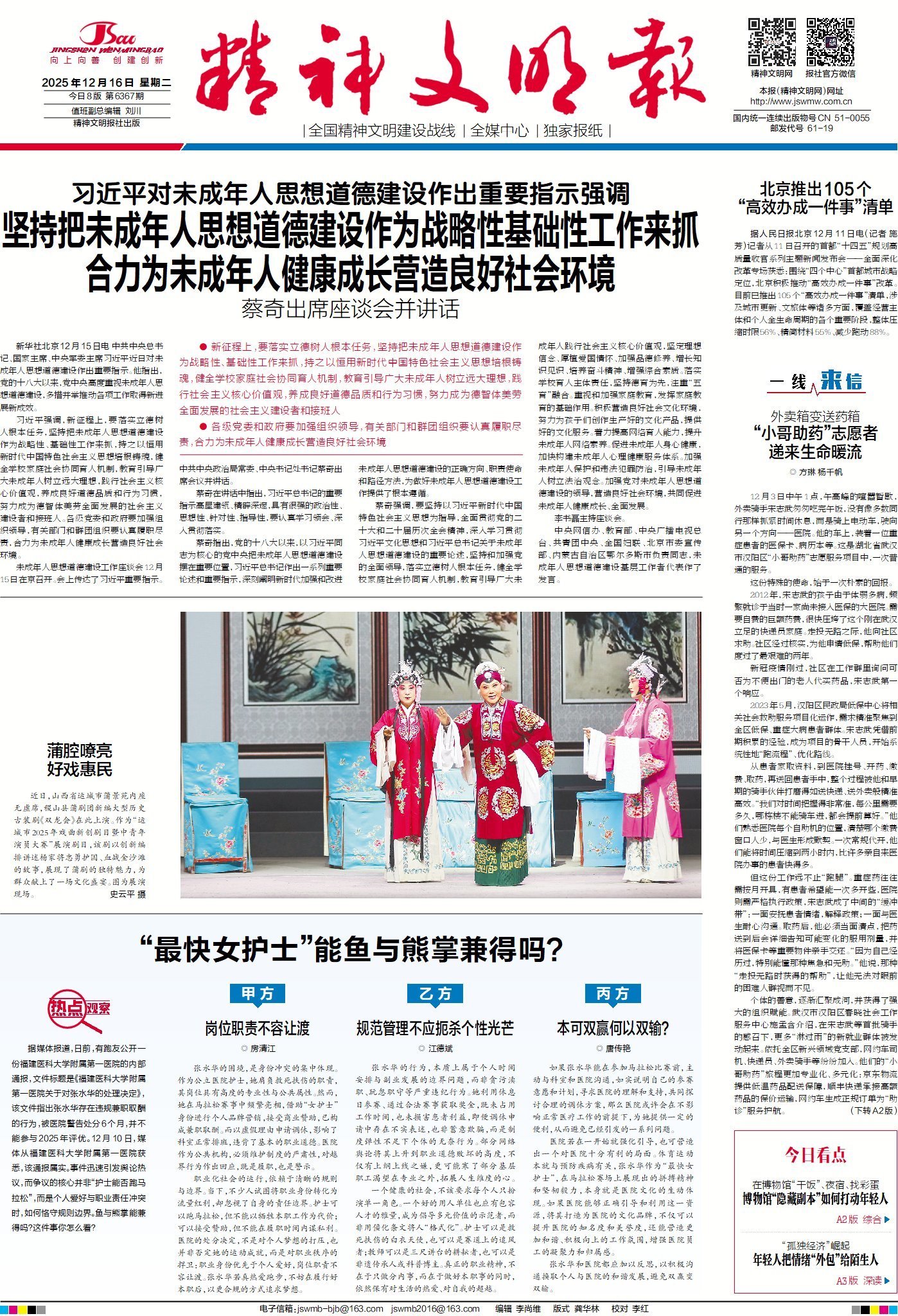 今日版面“早”知道:A1版头条聚焦习近平总书记对未成年人思想道德建设的重要指示;《热点观察》栏目围绕“最快女护士” 被警告处分事件,探讨个人爱好与职业责任的规则边界;《一线来信》栏目讲述武汉“小哥助药”志愿者将外卖箱变送药箱的暖心故事,传递善意力量;A2版直击各地博物馆“隐藏副本”热潮,展现文物“可吃可玩可夜宿” 的创新体验与文化传播新路径;A3版关注“孤独经济”崛起现象,剖析年轻人为“秒回师”等情绪陪伴服务买单的消费新趋势。