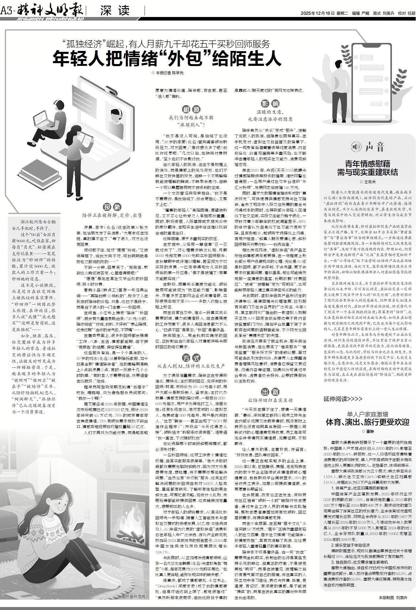 近日,浙江杭州00后女孩月薪9000元且吃住在家,却每月花近5000元购买秒回消息的服务,“秒回师” 一词因此登上热搜。不少网友表示理解,认为这是在为孤独买单。当下独居、高压、社交圈狭窄成为许多年轻人的常态,及时被倾听和回应变得稀缺,陪诊、陪拍、AI恋人、树洞聊天等相关消费也随之兴起,“孤独经济” 已从边缘现象发展成一个消费赛道。快到今日A3版看个明白。