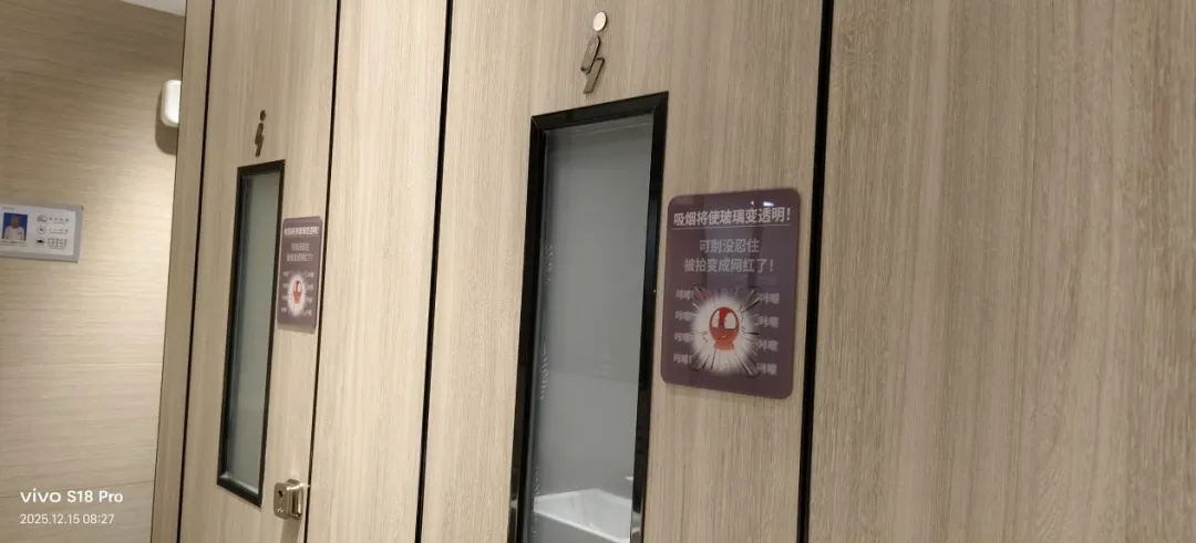 工作人员介绍,其工作原理是:当隔间内的烟雾报警器感应到吸烟产生的烟雾后,会触发电流使玻璃瞬间从雾化状态变为透明,以便管理人员“及时发现、及时管控”。目前,这类门主要安装在客流量较大的负一楼东区,已投入使用三四个月。律师认为,根据各地公共场所控制吸烟条例的规定,商场作为公共场所有权对吸烟行为进行管理,但是需要采取合理合法手段。虽然商场贴了提示语,但厕所隔间属于相对私密的空间,如厕行为是自然人不愿被他人窥探的私人活动,受民法典隐私权保护。而且设备还可能因故障误触发透明状态,一旦误触,则增加了侵权的必然性。