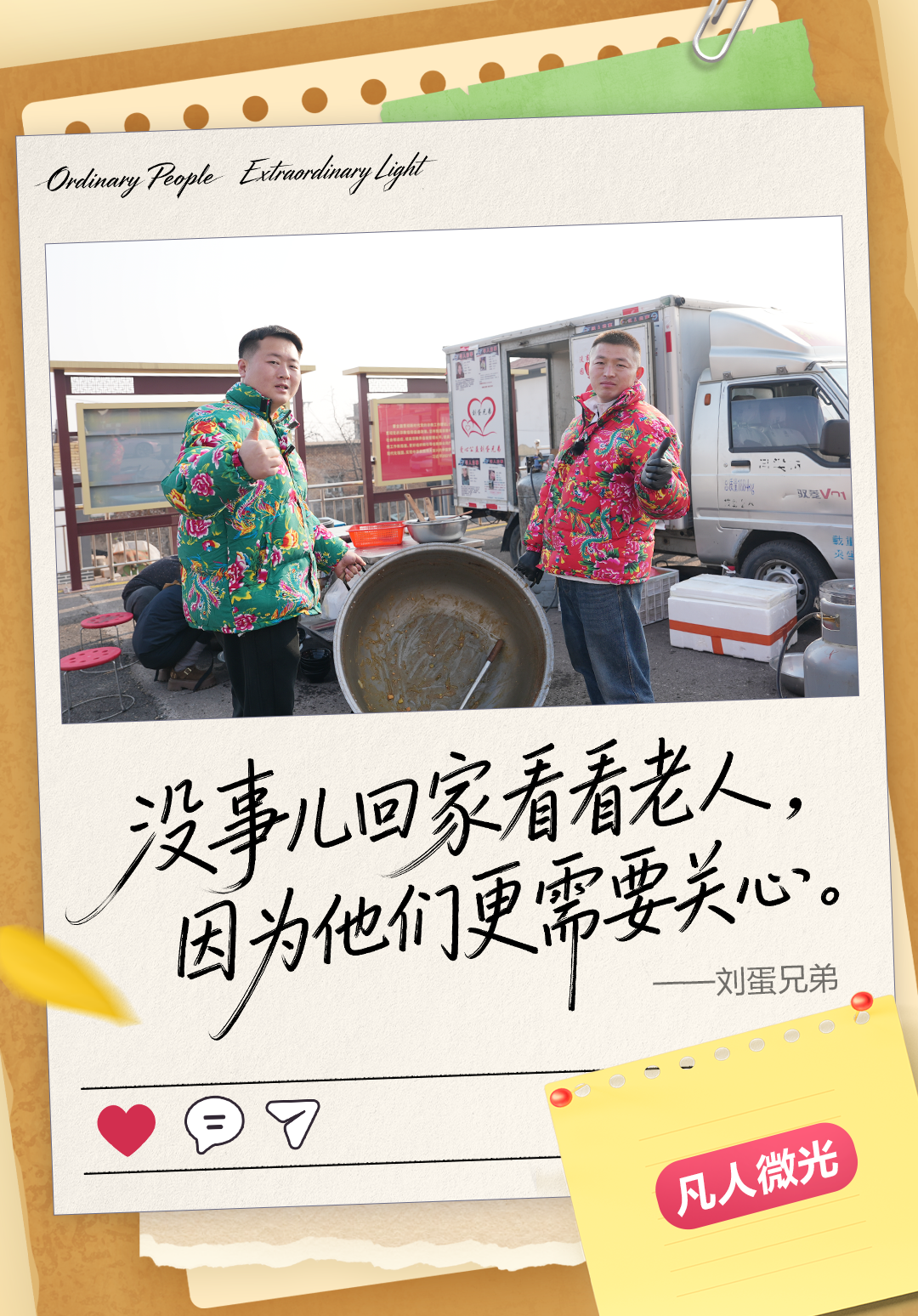 刘蛋兄弟用三个月的奔波,把“让老人吃好饭”这个简单的心愿,变成了实实在在的行动。从最初的一拍即合、说干就干,到三个月的风雨无阻、一路奔波,从家人的默默支持,到村民的真心点赞,或许,真正的“微光”,并非照亮天地,而是在某个寒冷的早晨,让一位老人觉得:今天,饭是热的,人是不孤单的。