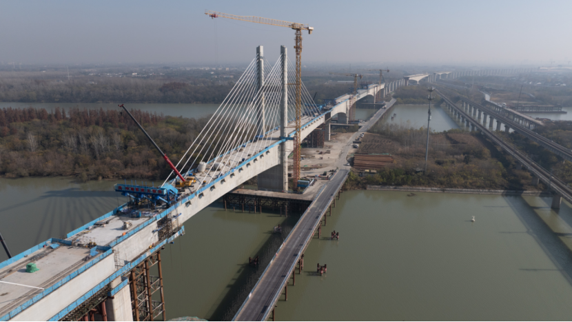 12月5日,北沿江高铁(沪渝蓉高铁上海至南京至合肥段)通泰扬特大桥跨新河斜拉桥合龙。