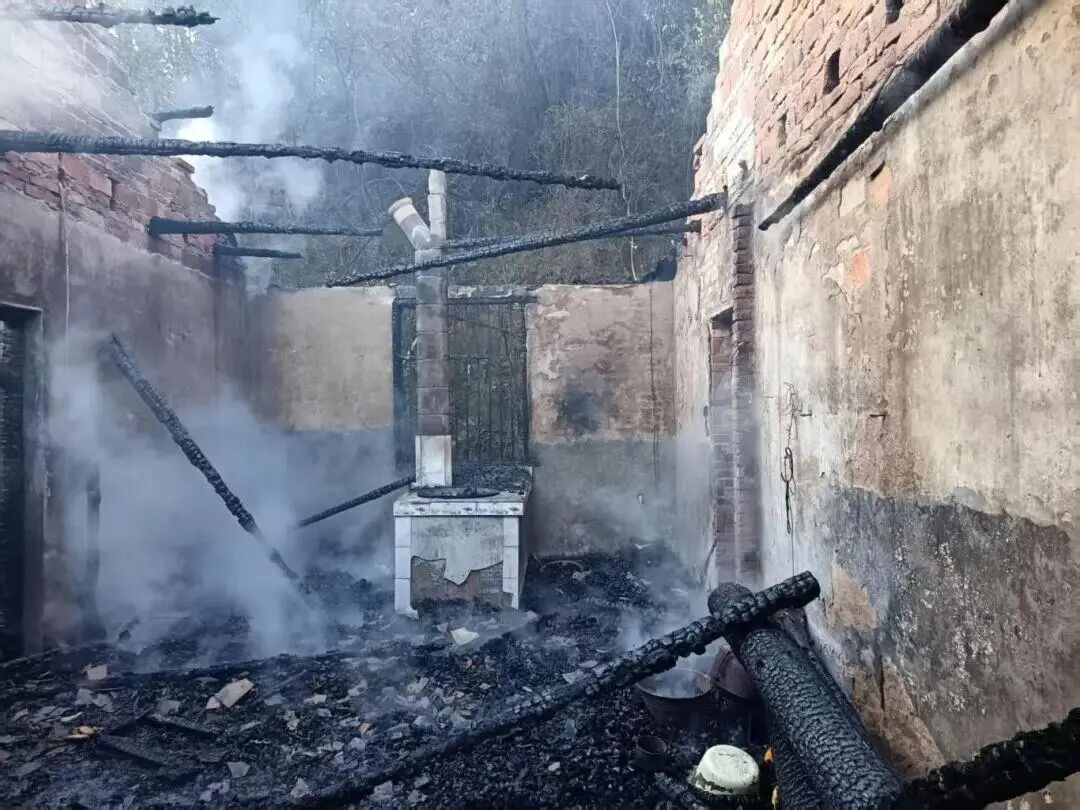 房屋顶部瓦片已被全部烧毁