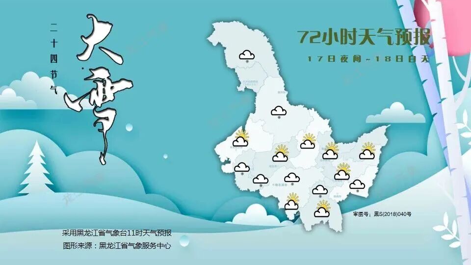 17日夜间到18日白天:大兴安岭、黑河、大庆、绥化南部、哈尔滨北部、鸡西、牡丹江北部多云有阵雪,其他地区晴有时多云。