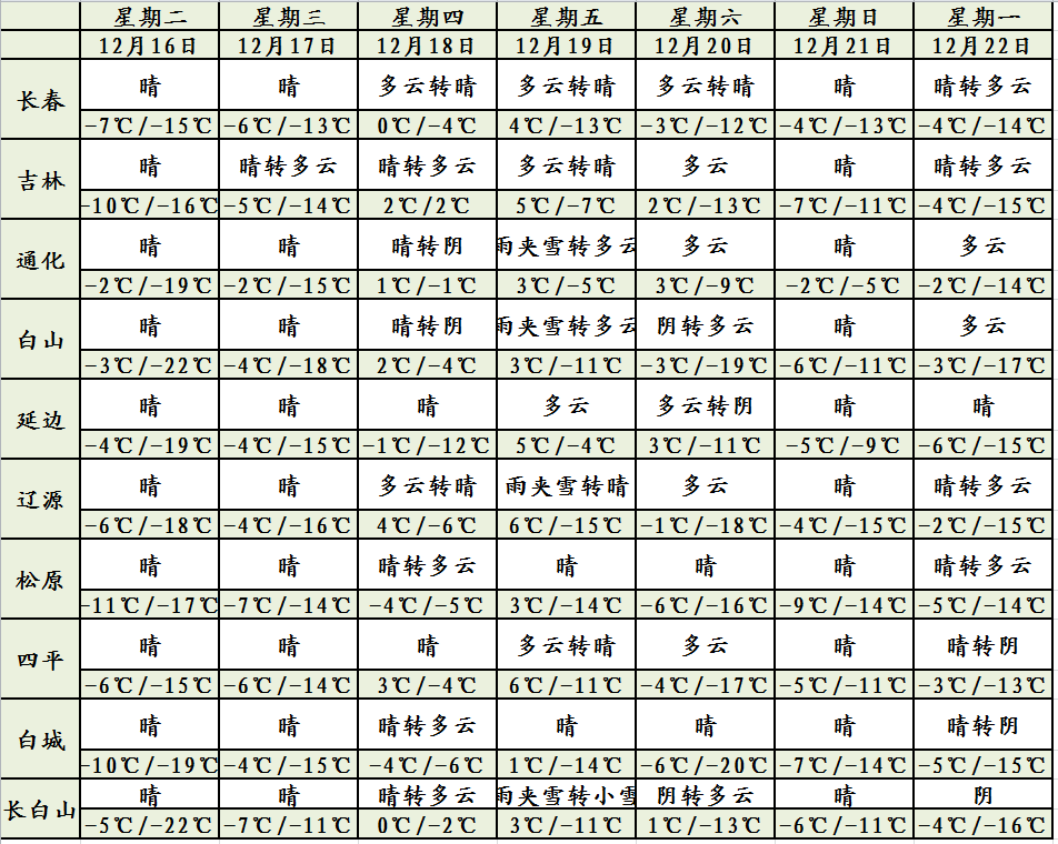 19日,通化、白山、长白山保护开发区有中到大雪,辽源、吉林、延边有小到中雪,松原、长春、四平有小雪。