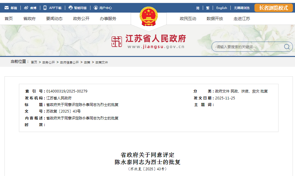 省政府关于同意评定陈永泰同志为烈士的批复(苏政复〔2025〕43号)盐城市人民政府:你市关于评定陈永泰同志为烈士的请示(盐政请示〔2025〕105号)收悉。现批复如下:陈永泰,男,2002年5月出生,响水县运河镇皂角村居民,2024年9月1日在施救落水群众过程中不幸牺牲。根据《烈士褒扬条例》第八条第一款第二项规定,同意评定陈永泰同志为烈士。 江苏省人民政府2025年11月25日