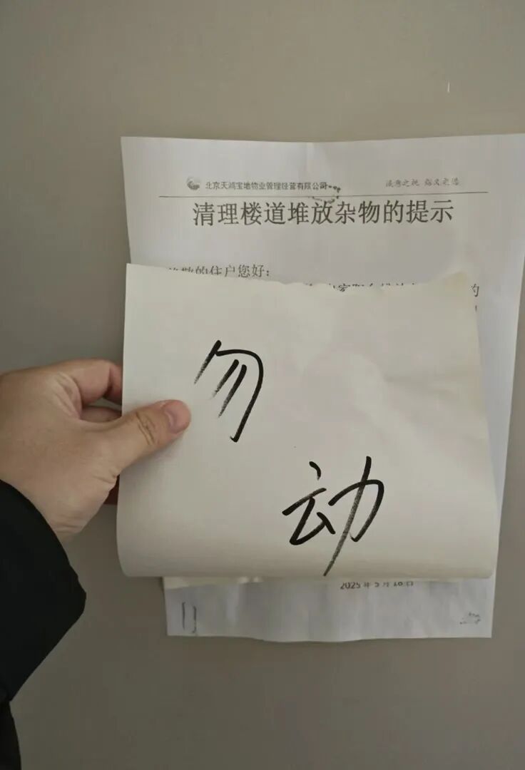 杂物堆积挤占通道同样也困扰着很多老旧小区。在天宁寺南里小区,楼道里杂物堆积的情况比较严重,属地在楼道里贴了很多要求居民自行清理的告知书,有人却在告知书上贴上了写有“勿动”的“反向告知”,真是让人又好气又好笑。