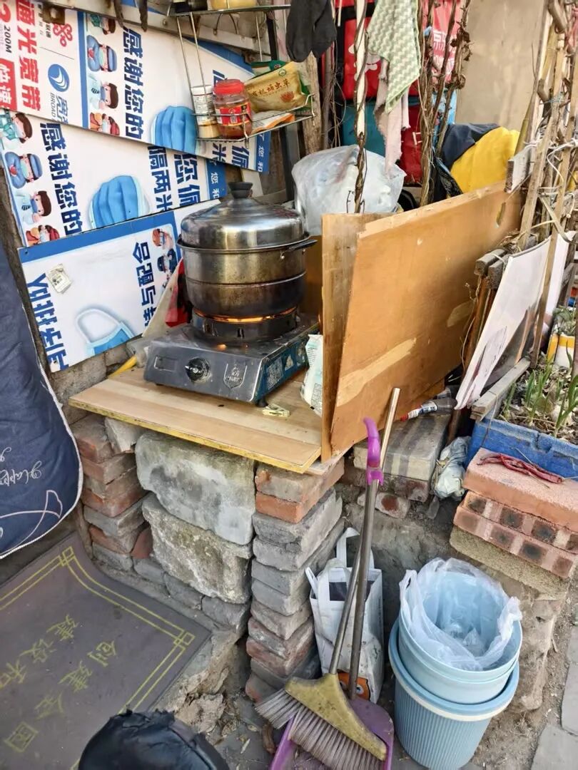 一路前行,记者看到贴着墙根儿摆着旧沙发、木头柜子及各类杂物,头顶上还有蛛网般的线缆,哪根还通着电、哪根是废弃电线改的晾衣绳,让人分不清楚。正是饭点儿,不时能闻到饭菜香,原来是有的居民把灶台搬到屋外。只见大锅下头的火苗子正在风中起舞,而灶台正被毛巾、塑料袋、木板等各式易燃物环绕。