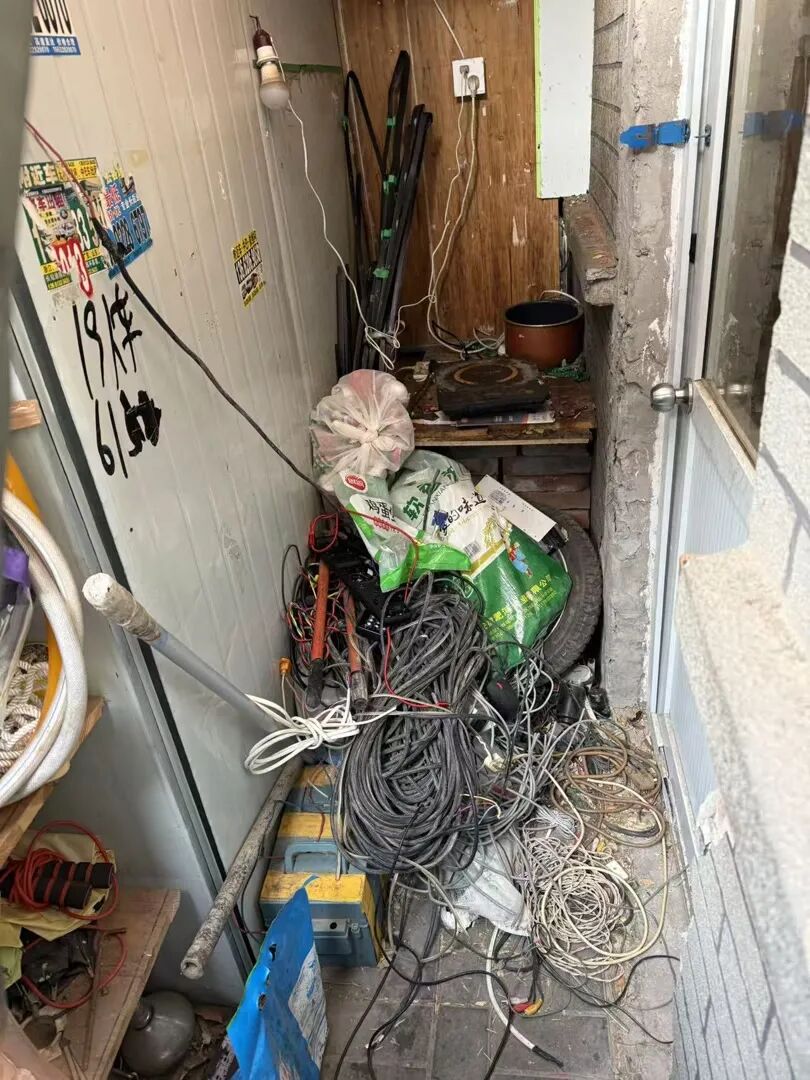 55号院门旁,还有一个用简易材料搭建的小棚子,整个棚子几乎被缠满各式各样的旧电线,一些旧电线的末端同样连着插线板或电动自行车充电器。小棚子的另一边,在一处大约只有1平方米的空间里,满地的杂物、一捆捆的旧电线让人下不去脚,桌台上还有插着电的电磁炉。