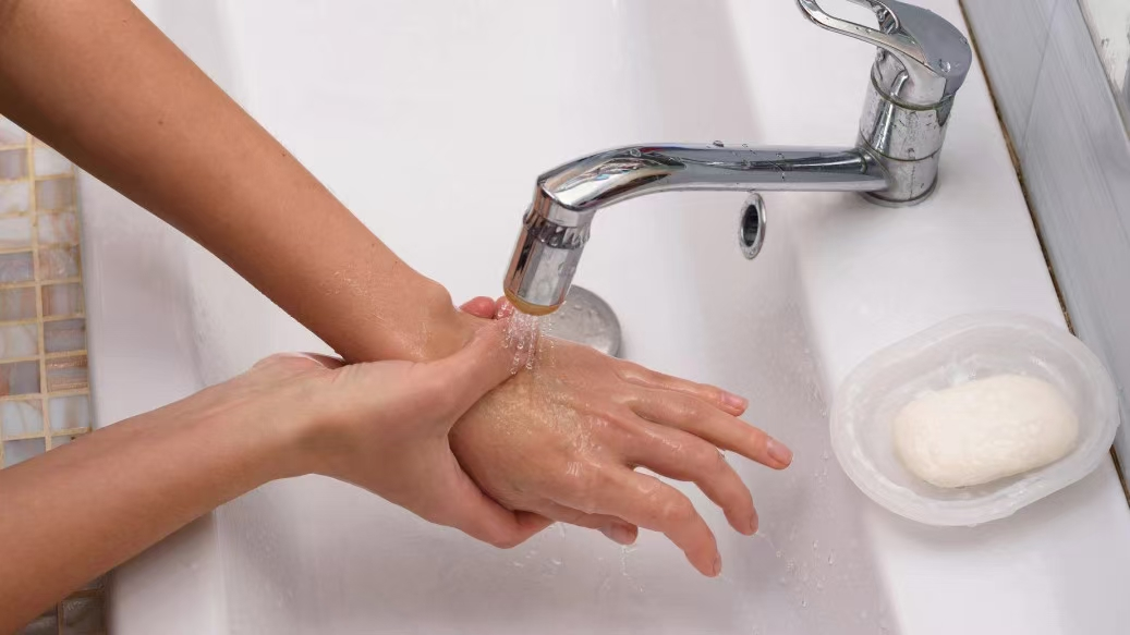 一旦发现烫伤,立即用流动的冷水,冲洗烫伤部位15~30分钟,水流不宜太大,避免水冲击力过大对烫伤部位造成二次伤害,加重皮损。