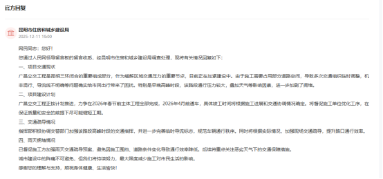 日前,有网友通过人民网“领导留言板”咨询,昆明三环闭合工程广昌立交桥何时竣工,何时恢复正常通行?对此,昆明市住房和城乡建设局回复表示,工程正按计划推进,力争在2026年春节前主体工程全部完成,2026年4月前通车,具体竣工时间将根据施工进度和交通协调情况确定。