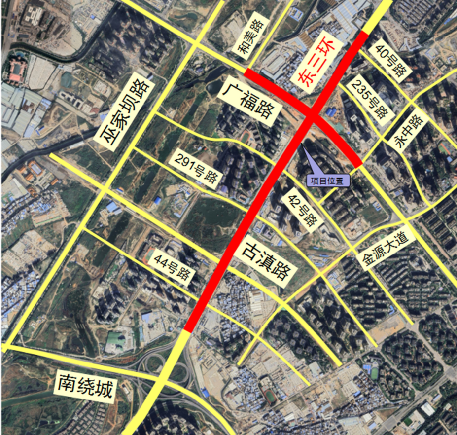 昆明市三环闭合工程东三环A段(罗衙立交至广昌立交)项目起于罗衙立交(不含罗衙立交),止于广昌立交(含广昌立交)。道路长约2180米,红线宽约60至84米,为城市快速路,主路设计时速80千米/小时,辅路设计时速40千米/小时。
