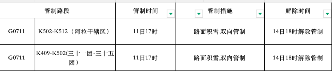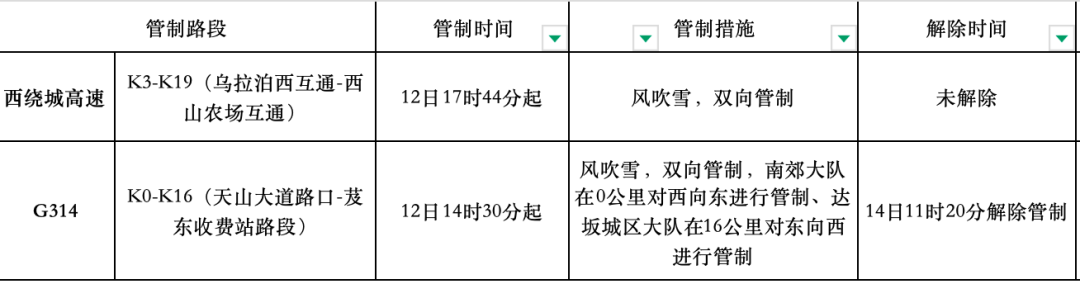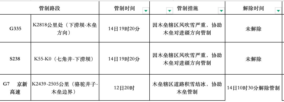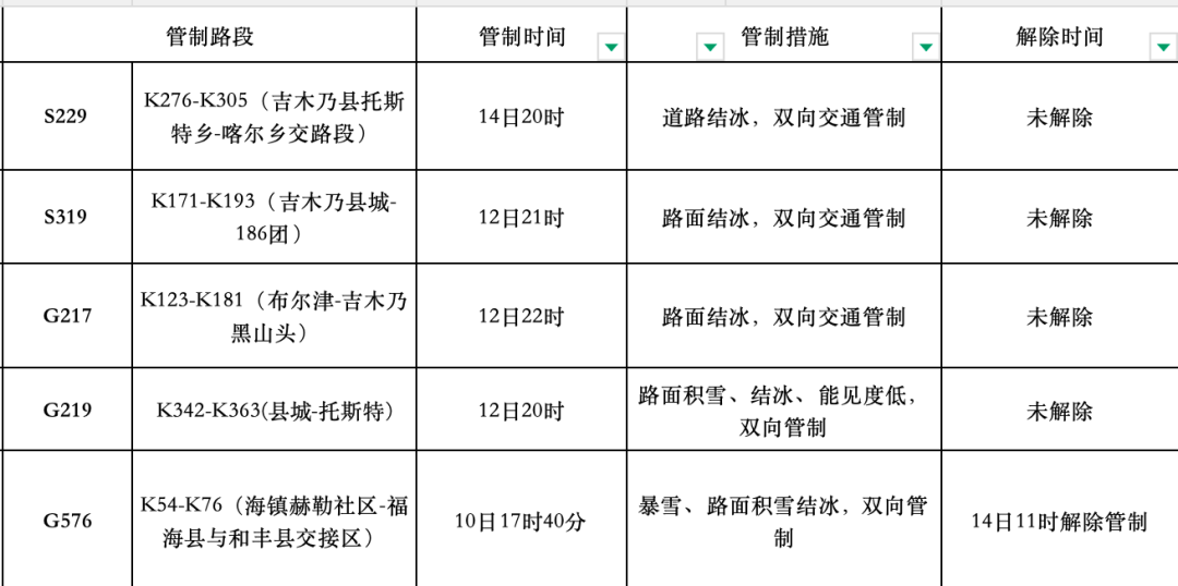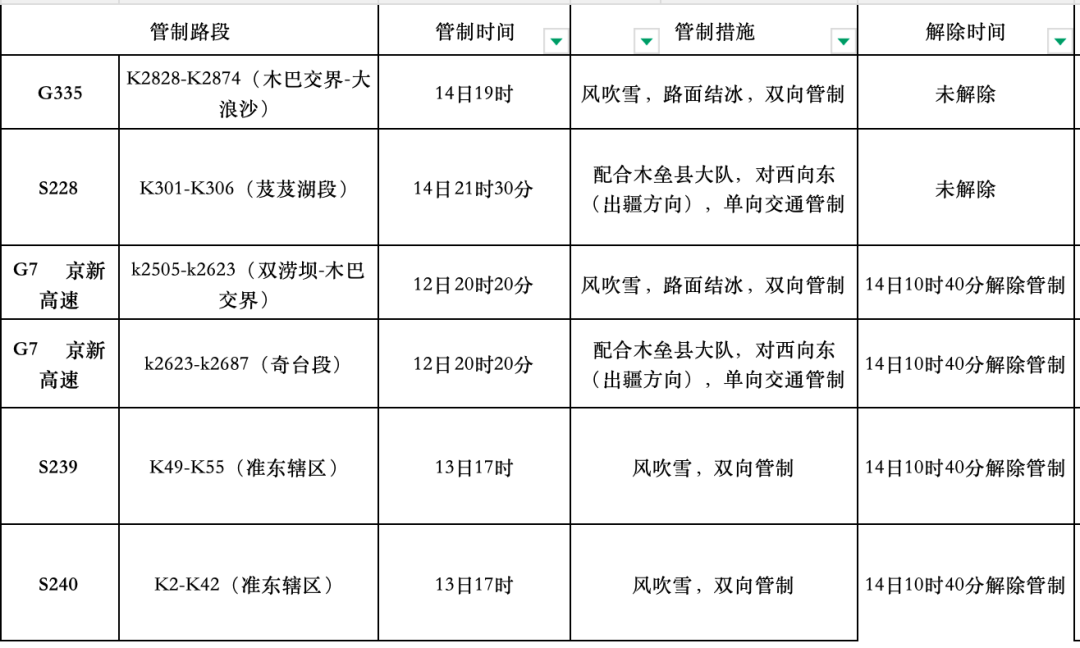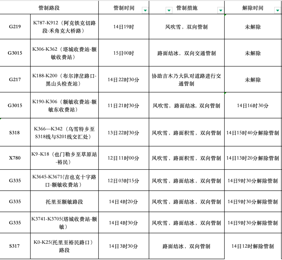 根据天气情况,自治区公安厅交管总队发布信息:截至12月15日10时,全区受恶劣天气影响实施临时交通管制的路段共28条,其中12条路段的管制尚未解除,16条路段的管制已解除。请过往车辆密切关注实时路况,提前合理规划出行路线,避免因管制影响行程。