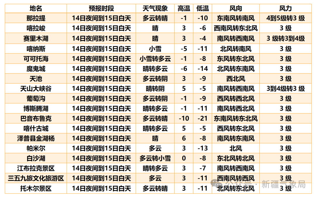 15日夜间-16日白天,伊犁河谷、塔城北部、阿勒泰部分区域有小雪,阿勒泰北部山区局部有中到大雪;北疆西部、北部有4~5级西北风(风口阵风8~9级),其余地区晴或多云、风力小。