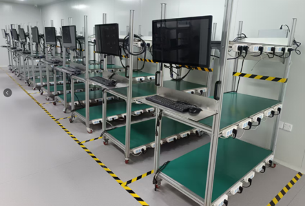据介绍,东华昆仑及华启智能的两条产线与广东省东莞市松山湖团泊洼华为实验室基地最新的高端手机产线属于同代产品,采用了当前业界领先的智能制造技术。在机器人下料区,工业机械臂末端配备了真空发生器和下料吸盘,并配套多种高精度传感器,形成一套高效、精准的自动化解决方案。该区域还引入双老化车循环下料机制,确保物料处理过程中的稳定性和连续性。值得一提的是,这套系统的末端设计能够支持高达50公斤的负载,这意味着无论是PC台式机还是2U及4U服务器等较重设备,都能轻松实现从生产线到老化架的自动摆放,整个过程安全可靠,极大地提高了生产效率和产品质量。这样的配置不仅体现了对传统制造业流程的革新,也标志着企业在智能化转型道路上迈出了坚实的一步。