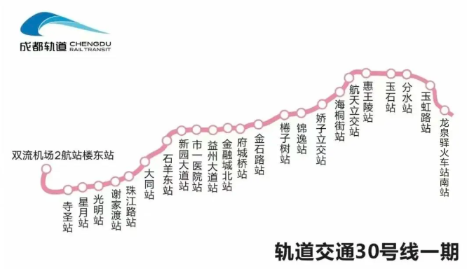 成都轨道交通30号线一期总体呈东西走向,西起双流机场2航站楼东站,东止龙泉驿火车站南站,连接双流区、高新区、锦江区、龙泉驿区。线路全长27.96km,共设车站24座,其中换乘站6座,可与2、5、6、8号线等线路实现换乘。