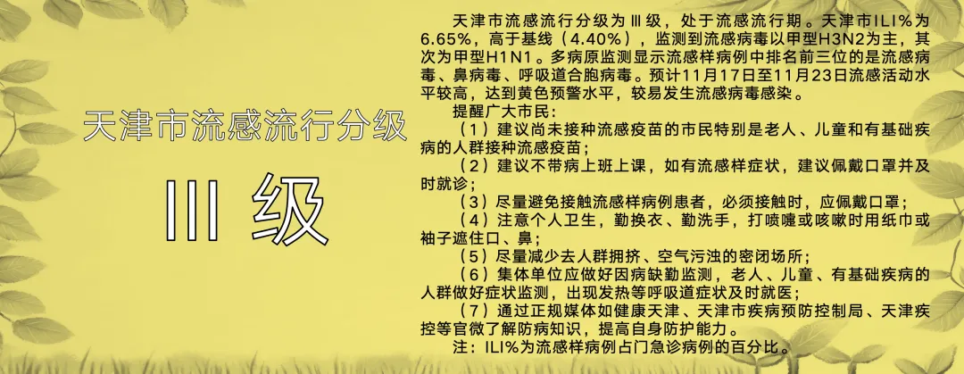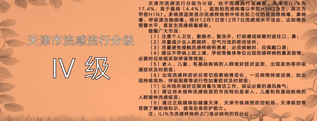 为进一步做好流感防控工作,科学、及时地将流感监测结果向社会反馈,天津市疾病预防控制局组织市疾病预防控制中心综合分析历年流感监测大数据,形成流感分级预警信息、相应级别防控重点及有关建议,指导群众做好预防,保护好易感人群。每周通过市卫生健康委官方微信(健康天津)、微博平台(天津健康)、市疾病预防控制局官方微信(天津市疾病预防控制局)及我市主流媒体对社会发布。