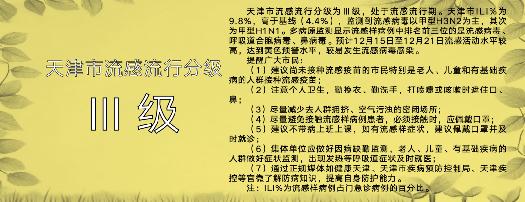 天津市流感流行分级为Ⅲ级,处于流感流行期。天津市ILI%为9.8%,高于基线(4.4%),监测到流感病毒以甲型H3N2为主,其次为甲型H1N1。多病原监测显示流感样病例中排名前三位的是流感病毒、呼吸道合胞病毒、鼻病毒。预计12月15日至12月21日流感活动水平较高,达到黄色预警水平,较易发生流感病毒感染。