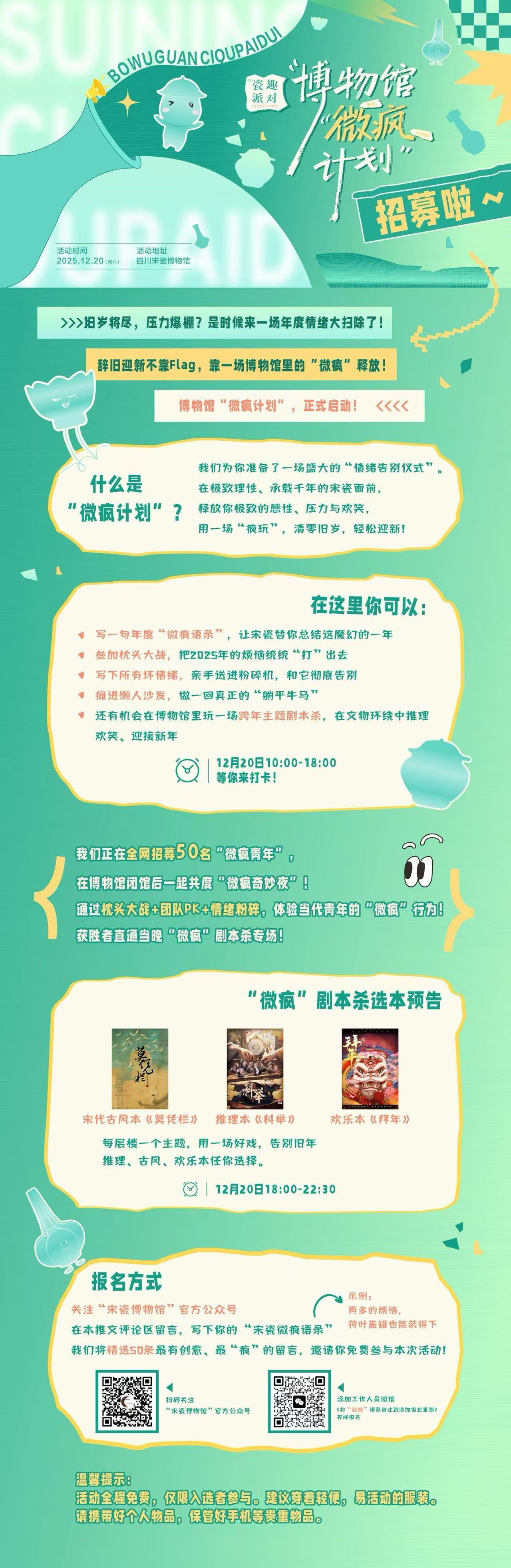 关注“四川宋瓷博物馆”官方公众号,在活动推文评论区留言你的“宋瓷微疯语录”,留言被精选的50名参与者将可免费参与活动。