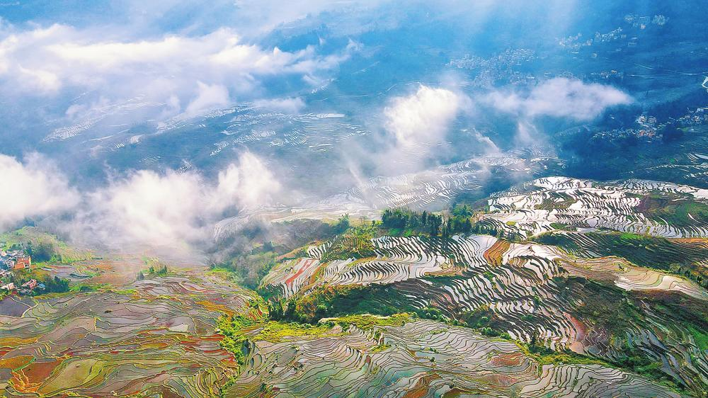 冬日,元阳哈尼梯田如万千银镜错落铺展,银波荡漾间,斑斓色彩交织辉映,宛如大地调色盘般的绝美景致吸引了全国各地的游客。每年11月至次年4月是哈尼梯田丰水期,也是最佳观赏时段。
