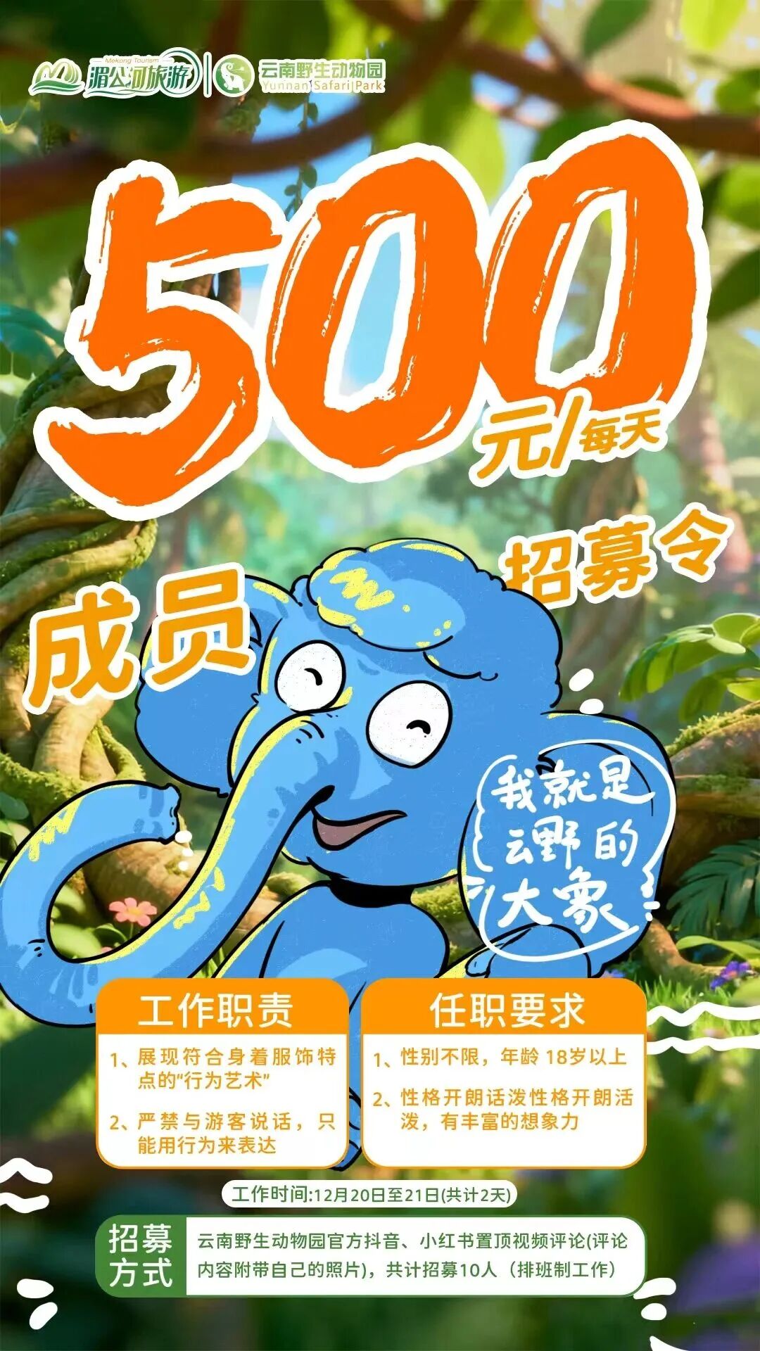 此前,云南野生动物园招募“野人”的活动十分火热。日前,该动物园又招募NPC了!工作时间:12月20日至21日(共计2天);工资:500元每天;报名参与方式:云南野生动物园官方抖音、小红书置顶视频评论区留言评论(附带自己的“行为艺术”,能够加分哦~)。