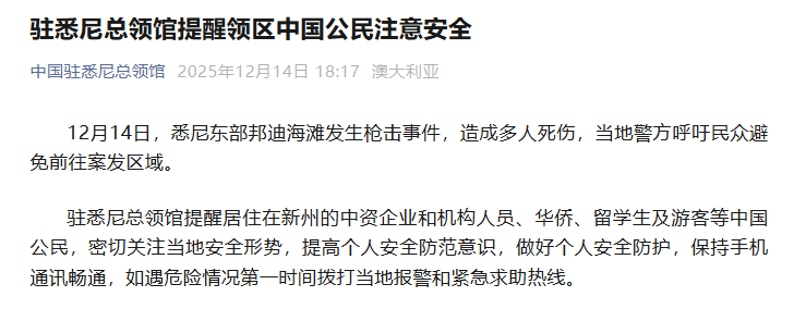 中国驻悉尼总领馆提醒领区中国公民注意安全12月14日,悉尼东部邦迪海滩发生枪击事件,造成多人死伤,当地警方呼吁民众避免前往案发区域。