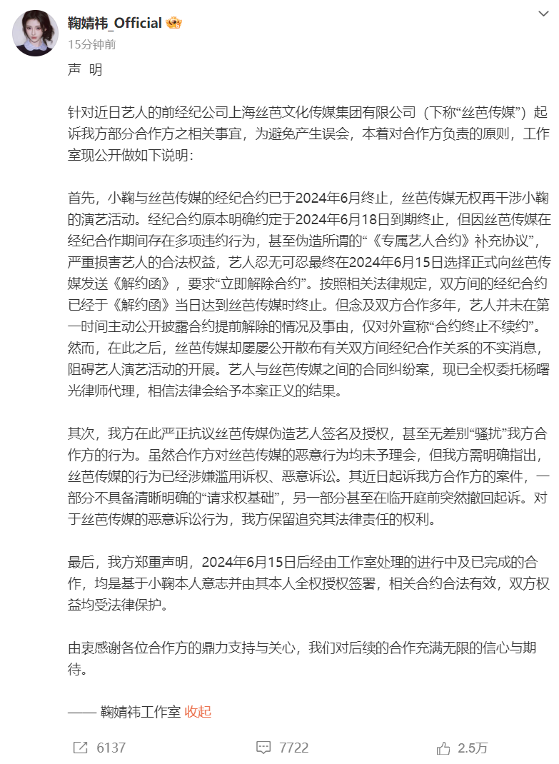 刚刚,鞠婧祎_Official 发布声明,称鞠婧祎与丝芭传媒的经纪合约已于2024年6月终止,合约原定2024年6月18日到期终止,但因丝芭传媒存在多项违约行为,甚至伪造补充协议,因此艺人在2024年6月15日要求解除合约。