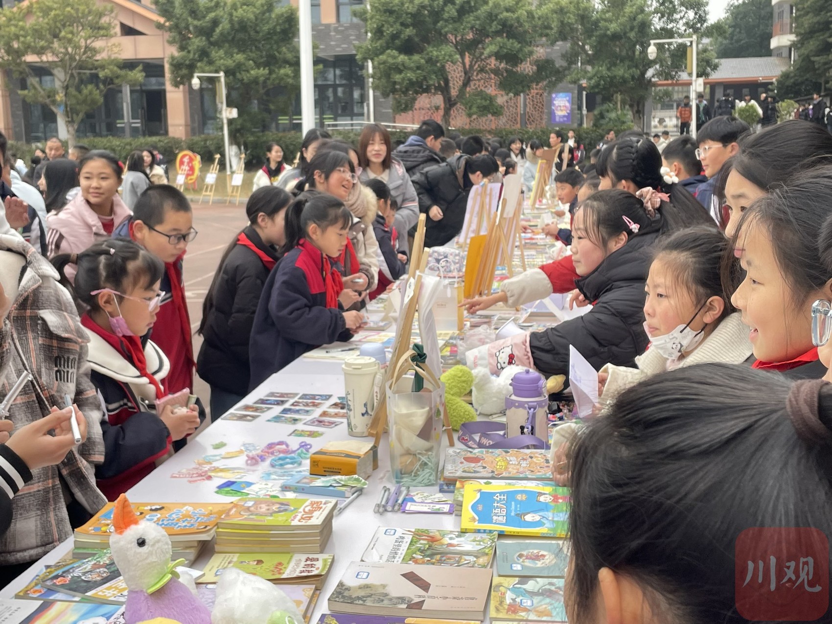 当天,遂宁市龙凤实验学校的操场变身书香集市。跳蚤书市、天府书展、趣味阅读游戏吸引着孩子们,在教学楼内,由农家书屋补充建立的图书角、阅读驿站随处可见。