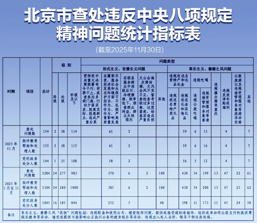 “清风北京”12月16日消息,日前,北京市纪委监委公布今年1月至11月查处违反中央八项规定精神问题统计指标表。截至11月30日,累计查处违反中央八项规定精神问题1284起,批评教育帮助和处理1304人,其中局级24人、处级280人、科级及以下1000人。