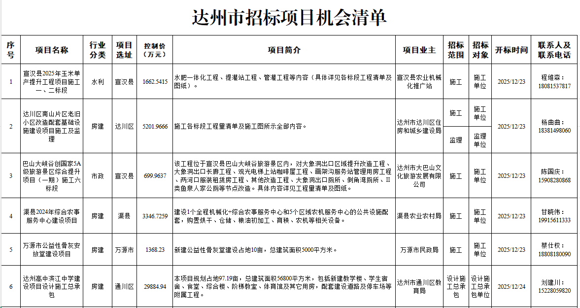 招标项目29个,投资金额20.25亿元。待招标人发布招标公告后,有意向参与投标的企业可以通过注册“达州市公共资源交易服务网”,关注相关招标信息,登录即可了解参与报名投标。