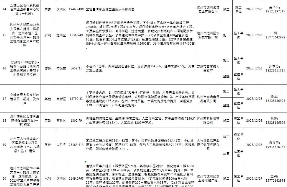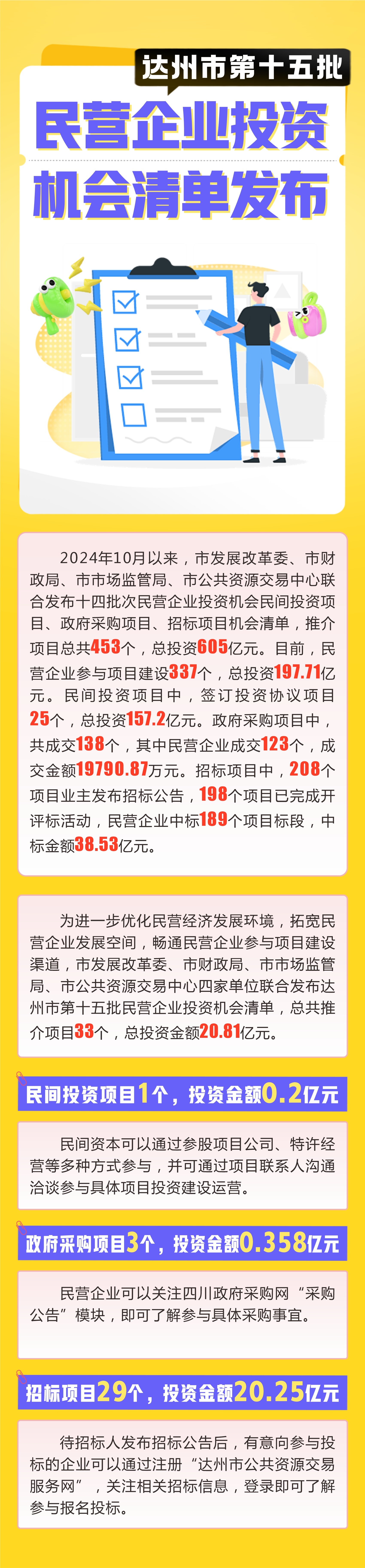 12月16日,为进一步优化民营经济发展环境,拓宽民营企业发展空间,畅通民营企业参与项目建设渠道,达州市发展改革委、达州市财政局、达州市市场监管局、达州市公共资源交易中心四家单位联合发布达州市第十五批民营企业投资机会清单,总共推介项目33个,总投资金额20.81亿元。
