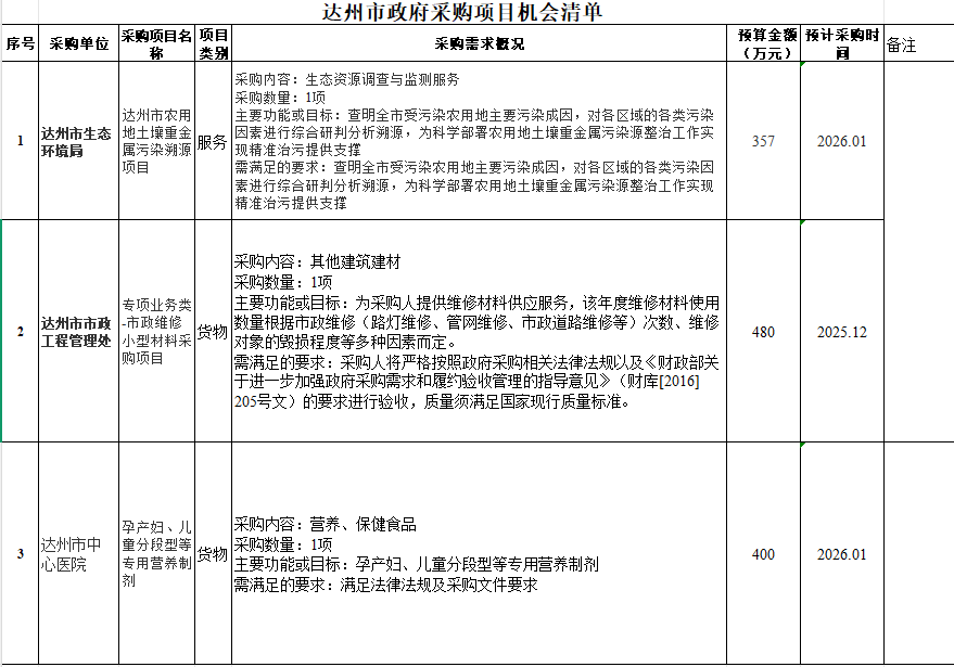 政府采购项目3个,投资金额0.358亿元。民营企业可以关注四川政府采购网“采购公告”模块,即可了解参与具体采购事宜。