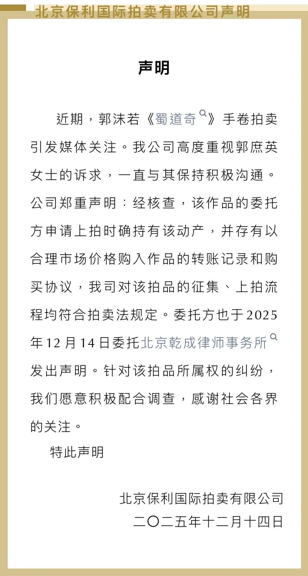 12月14日,北京保利拍卖发布声明:针对拍品所属权的纠纷,积极配合调查。