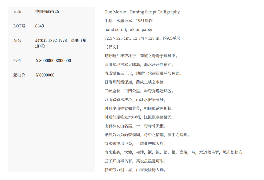 拍品信息说明显示,该手卷1961年作,题识信息为:“右《蜀道奇》一首,乃一九六一年九月十八日乘江泸轮出三峡时,在舟中所作。得此,可谓不虚此行。书付庶英。郭沫若。一九六一年十月十四夜灯下。”该件拍品的说明中除了盛赞郭沫若的书法水平外,还写道:“郭沫若自作诗手迹多保存于纪念馆、博物馆等国家机构。如此文采斐然、传承有序、着述累累、原装原裱的郭沫若自作诗小行草长手卷在拍卖市场没有先例,后未必有来者,更显此卷的独一无二。”