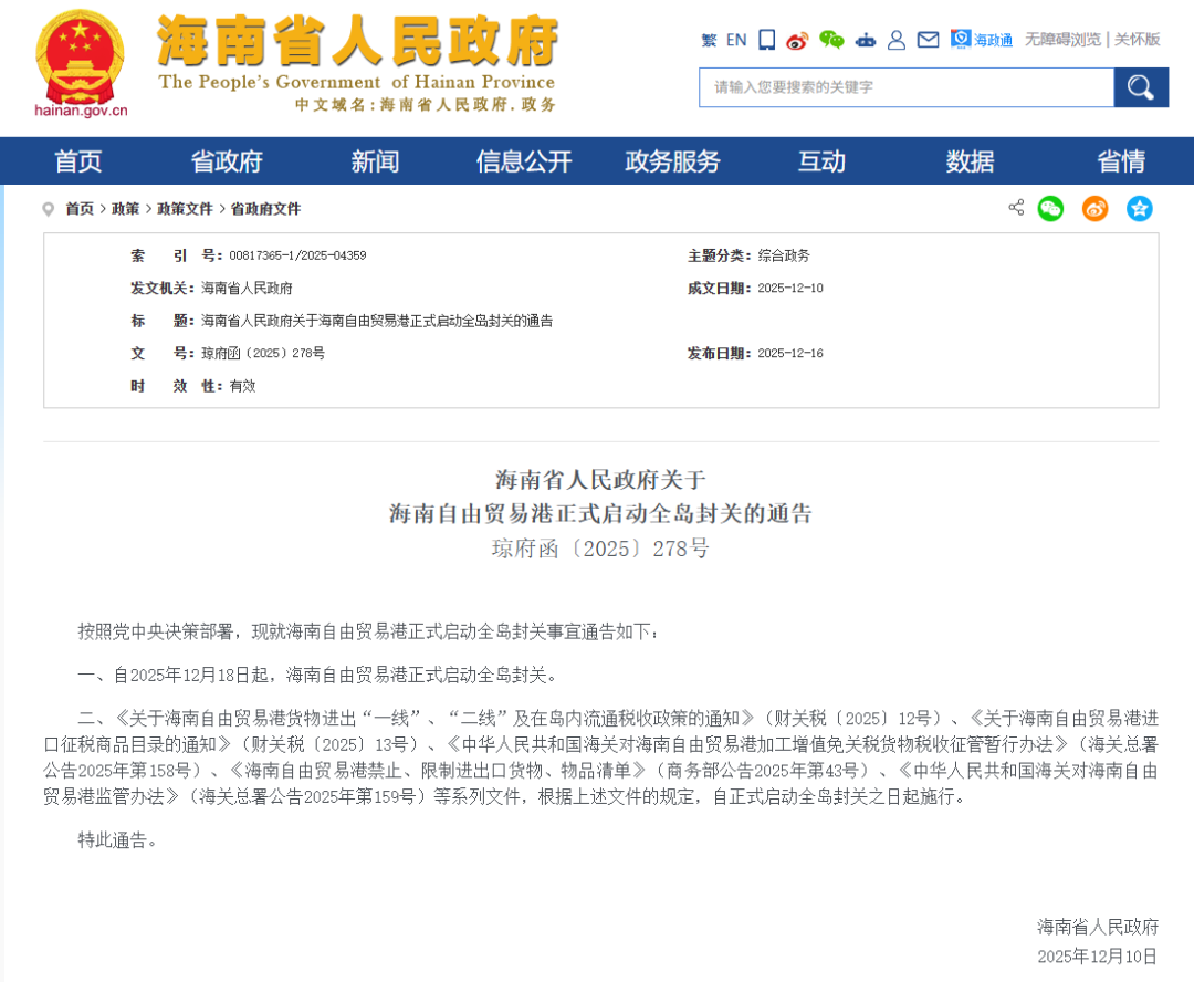 通告称,按照党中央决策部署,自2025年12月18日起,海南自由贸易港正式启动全岛封关,系列文件自正式启动全岛封关之日起施行。