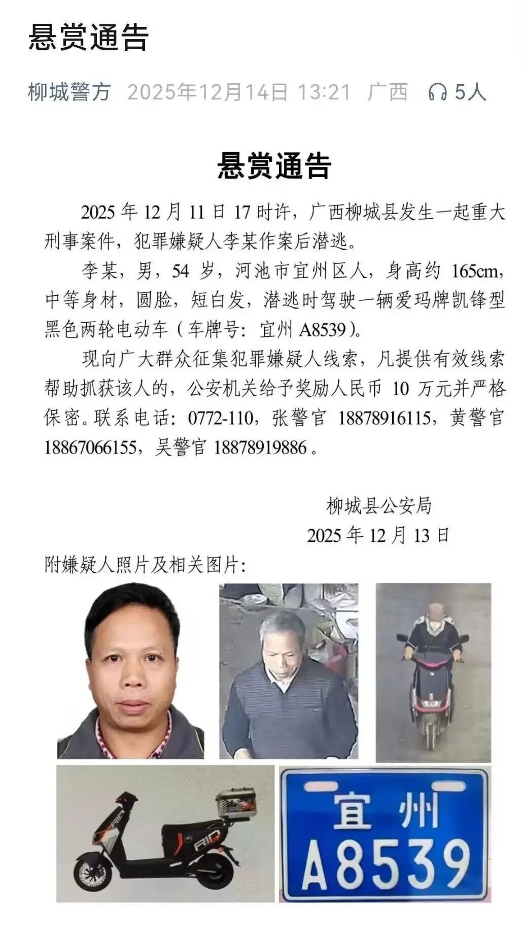 当地警方另发布悬赏通告称,李某身高约165厘米,中等身材,圆脸,短白发,逃跑时身穿黑色上衣,驾驶爱玛牌凯锋型黑色两轮电动车(九成新),车牌号为宜州A8539。凡提供线索帮助抓获该人员的,给予奖励10万元。