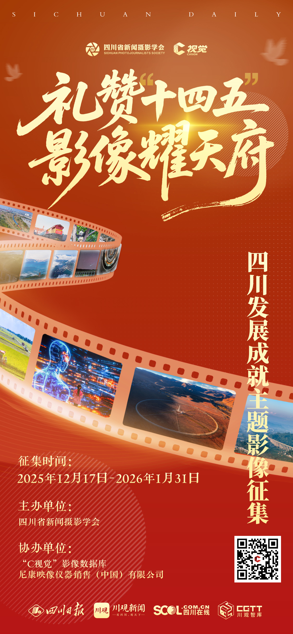 为生动记录并全面展现这五年间的深刻变革与丰硕成果,用镜头讲好四川故事、镌刻时代记忆,四川省新闻摄影学会、“C视觉”影像数据库、尼康映像仪器销售(中国)有限公司联合发起“礼赞‘十四五’·影像耀天府”大型主题影像征集活动,即日起面向全社会公开征集优秀图片及视频作品。