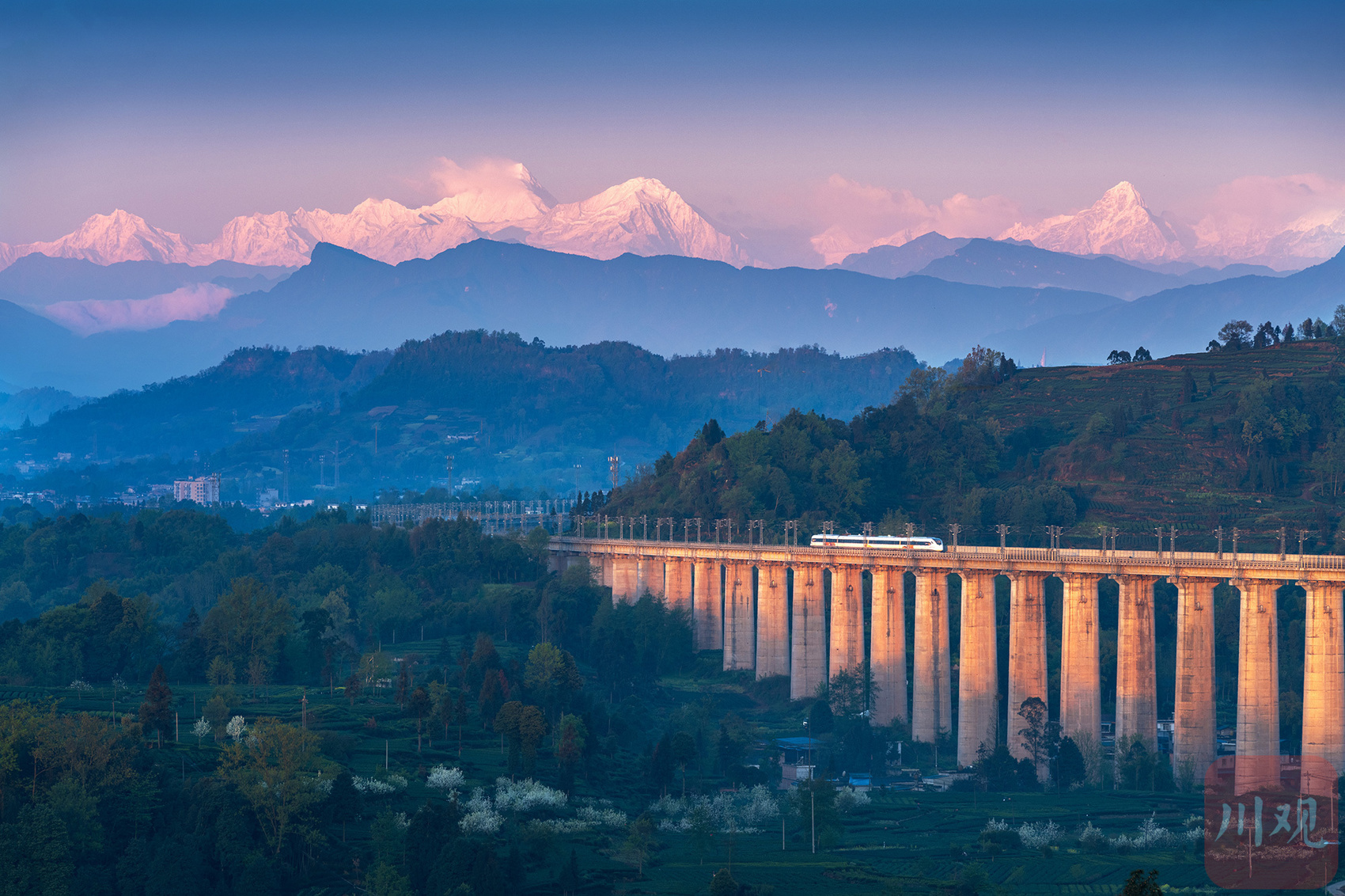 2024年3月28日,阳光打在雅安市名山区骑龙村。贡嘎雪山下,一辆列车驶过川藏铁路成雅段。C视觉签约摄影师 王治 摄