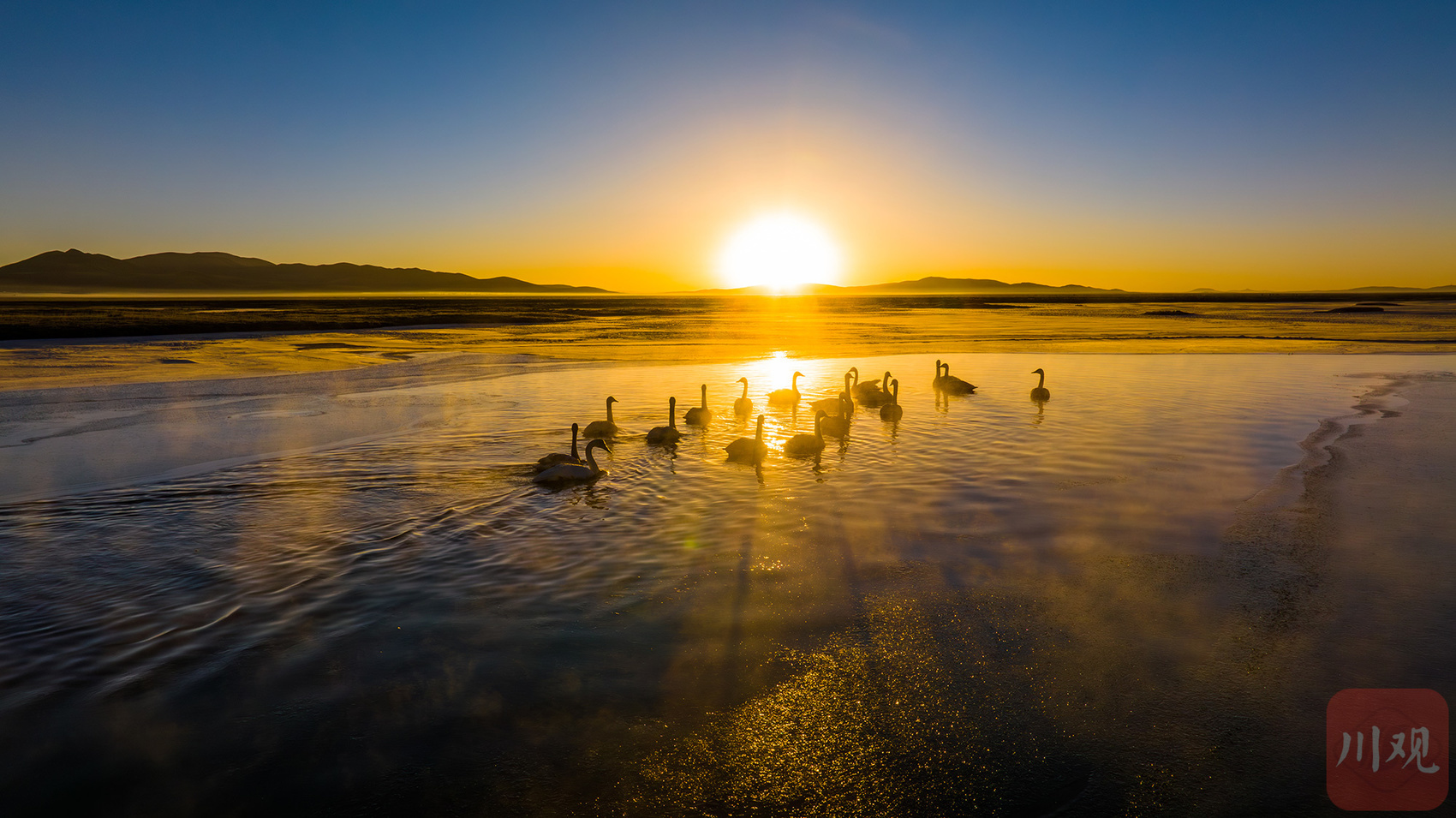 2024年1月13日,成群的野生大天鹅陆续飞临阿坝州若尔盖县高原小镇麦溪乡的洛贾琼果河栖息越冬。C视觉签约摄影师 姜跃斌 摄