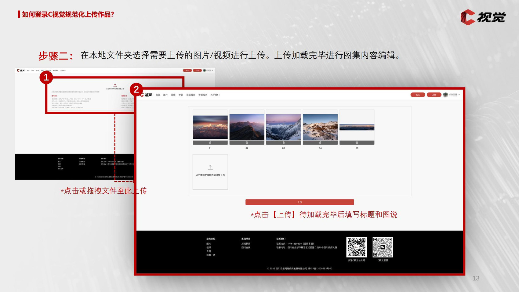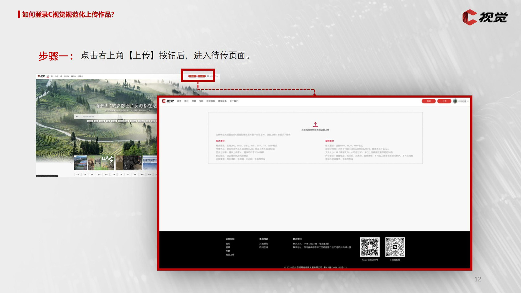 第一步:登录C视觉官网,登录已签约供稿人账号,在官网首页右上角点击“上传”。