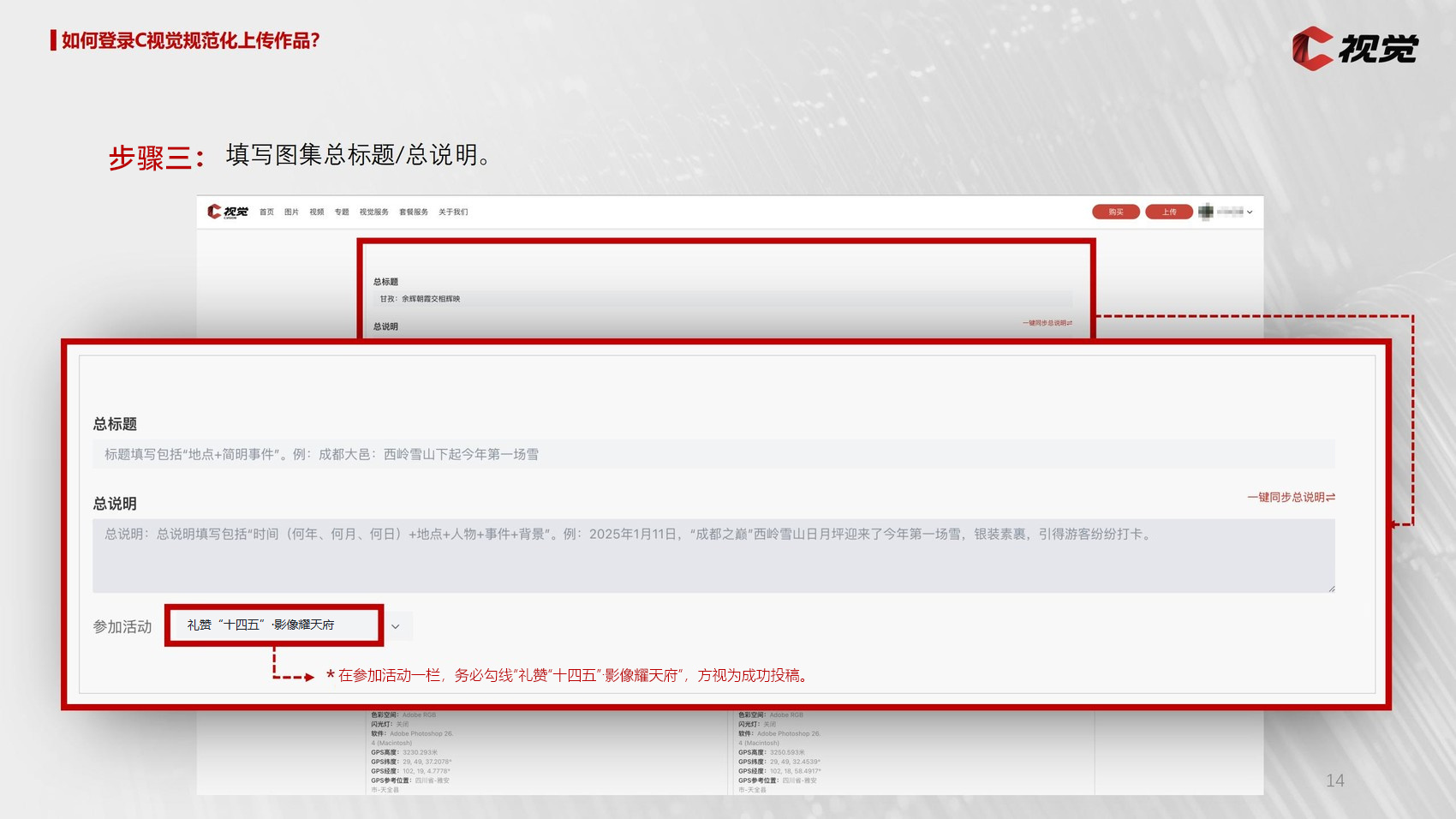 第三步:在填写完“总标题”“总说明”后,请务必在参加活动一栏,勾线“礼赞“十四五”·影像耀天府”,方视为成功投稿。