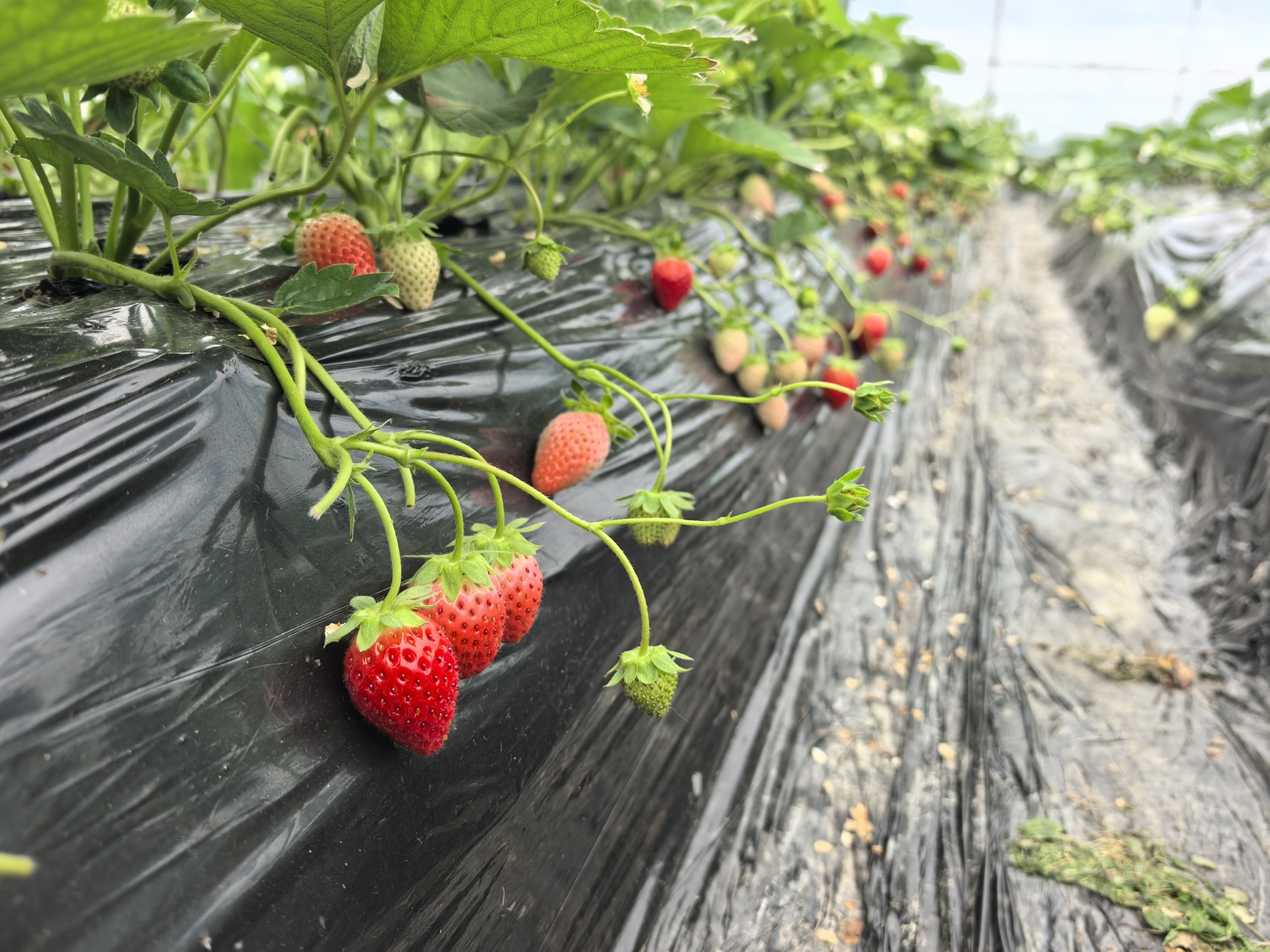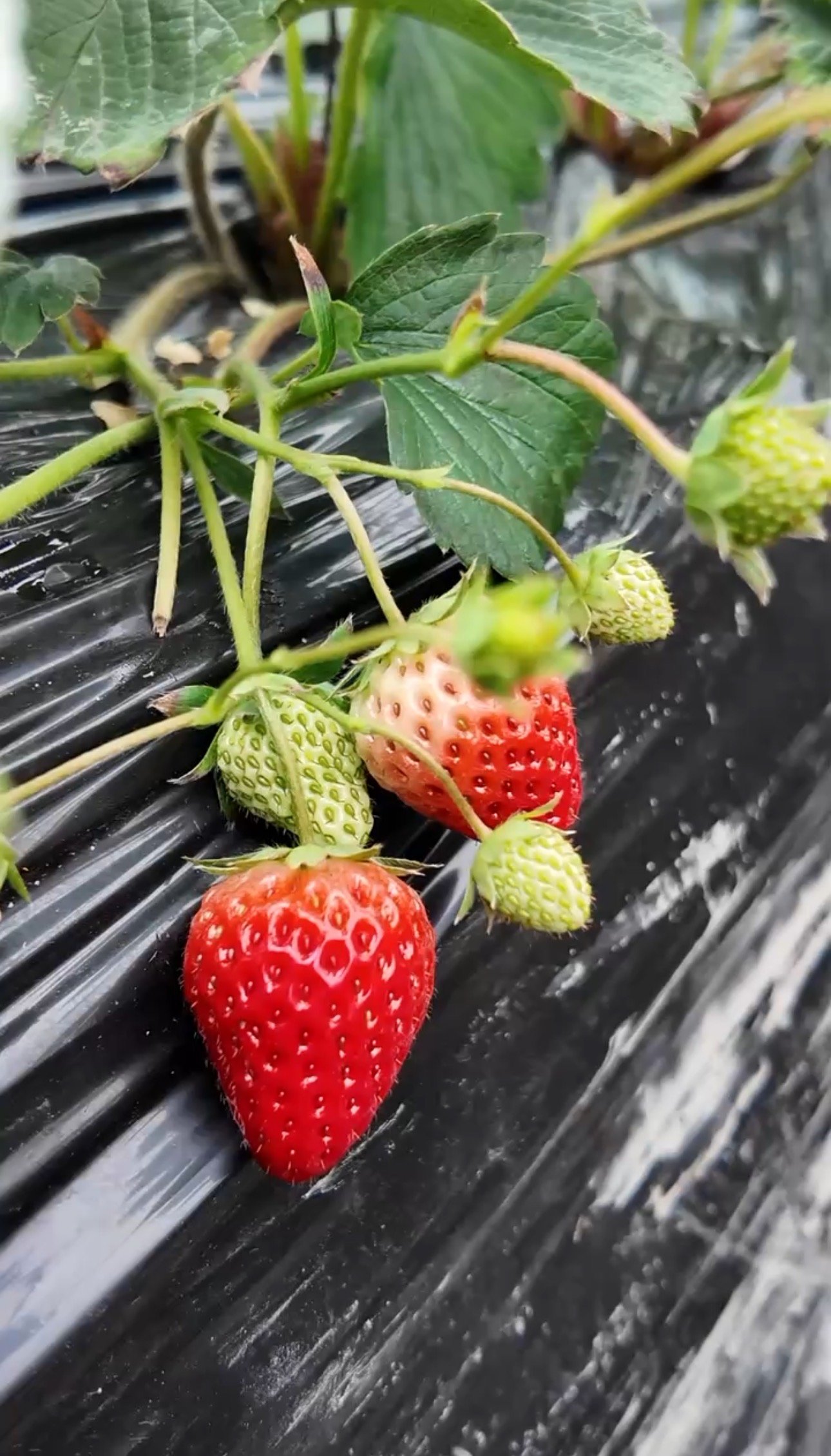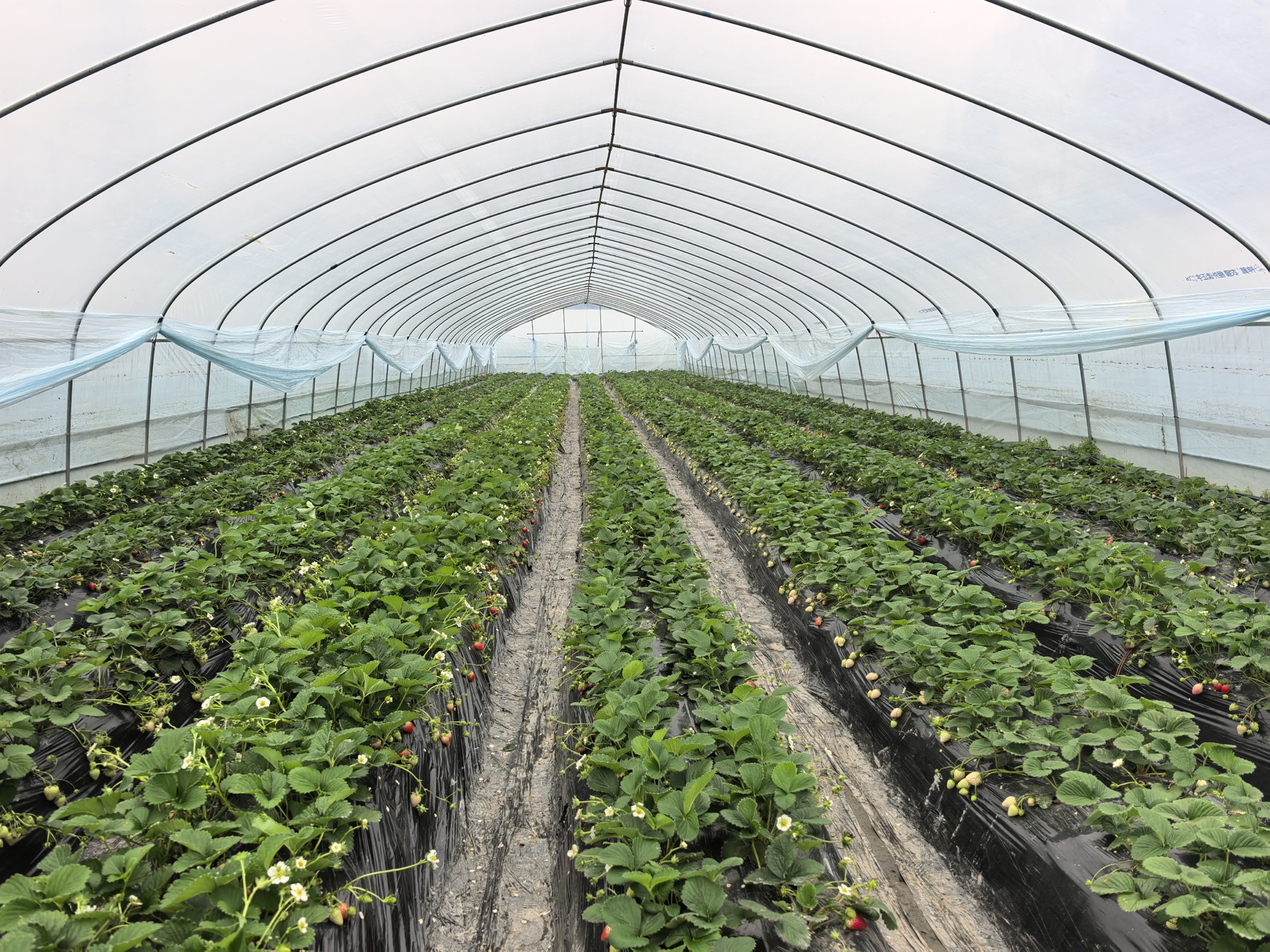 棚内,不同品种的草莓植株长势各异。