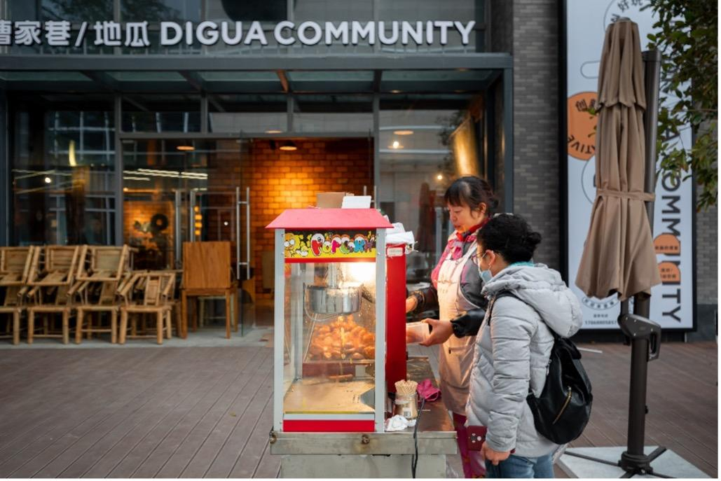 从成都地铁3号线红星桥站出来,穿过高楼林立的街道,一栋灰色复古墙砖、内部暖黄色调的建筑格外引人注目。这里曾是曹家巷片区废弃的仓库,如今,它有了个新名字——“地瓜社区”。