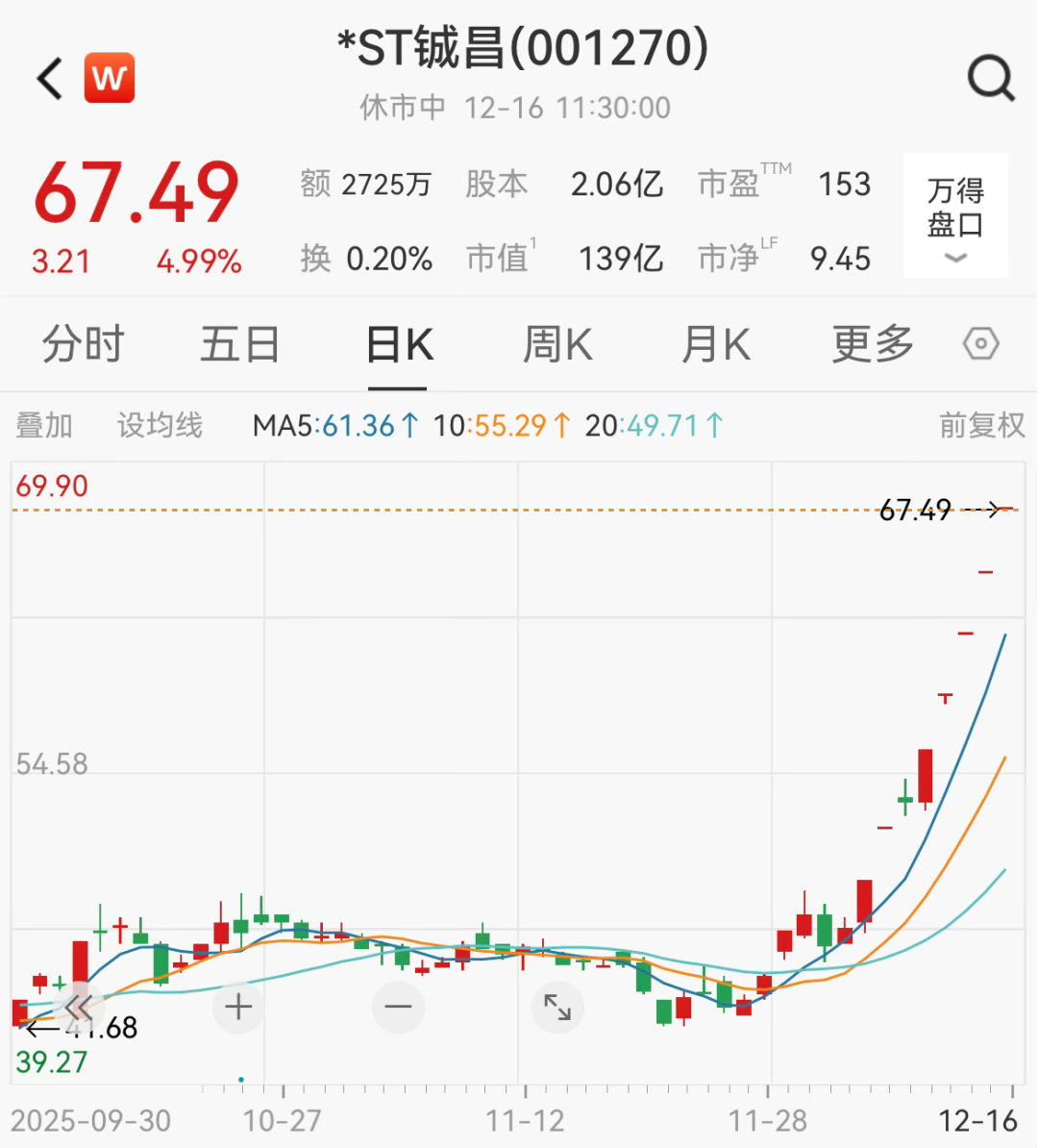 12月16日上午,*ST铖昌再次涨停,现报67.49元/股,走出8日7板。