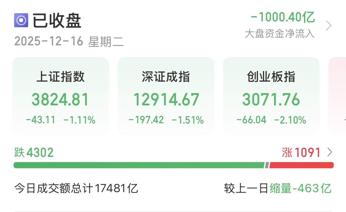 12月16日,A股三大指数再度集体回调。截至收盘,沪指跌1.11%,收报3824.81点;深证成指跌1.51%,收报12914.67点;创业板指跌2.10%,收报3071.76点。全市场全天成交额17481亿元,较昨日缩量463亿元。