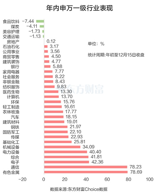 目前消费板块的潜力究竟如何?东方财富Choice数据显示,截至12月15日收盘,食品饮料是申万一级行业中跌幅最大的行业,累计下跌7.44%。美容护理也是累计下跌,跌幅为1.73%。商贸零售虽然累计上涨4.5%,但在涨幅排名中十分靠后。