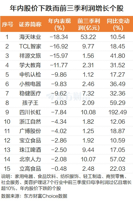 从个股情况来看,不少消费股的业绩在涨,但股价在跌,具备“黄金坑”的特质。如海天味业、TCL智家等,前三季度利润分别上涨超53亿元、9亿元,股价年K线下跌均超15%。业内专家认为,政策确定性与业绩弹性是投资者需要兼顾的两条主线,在市场量能不足的情况下,可以考虑关注这些股票的后续走势,考虑分批布局。