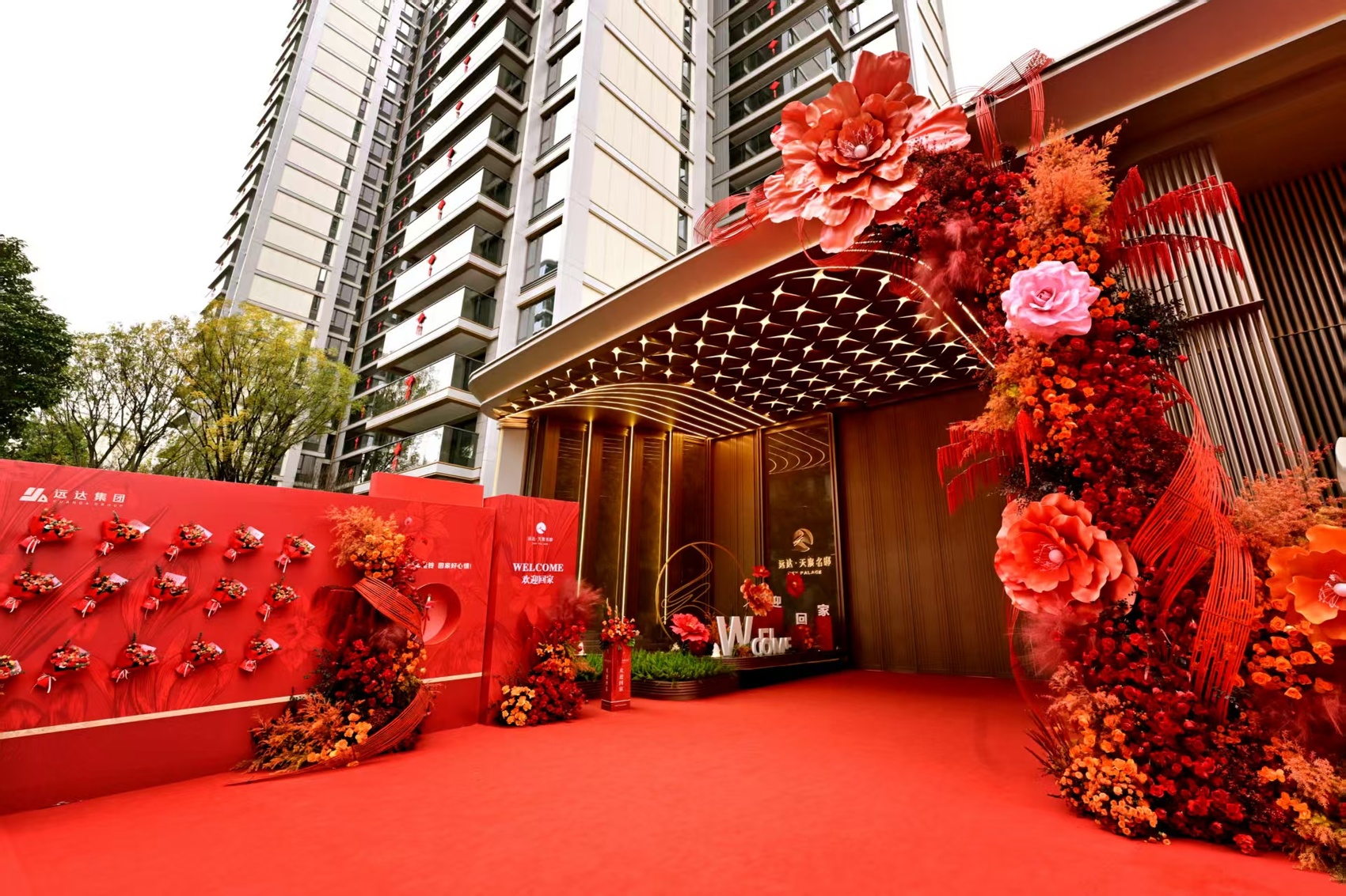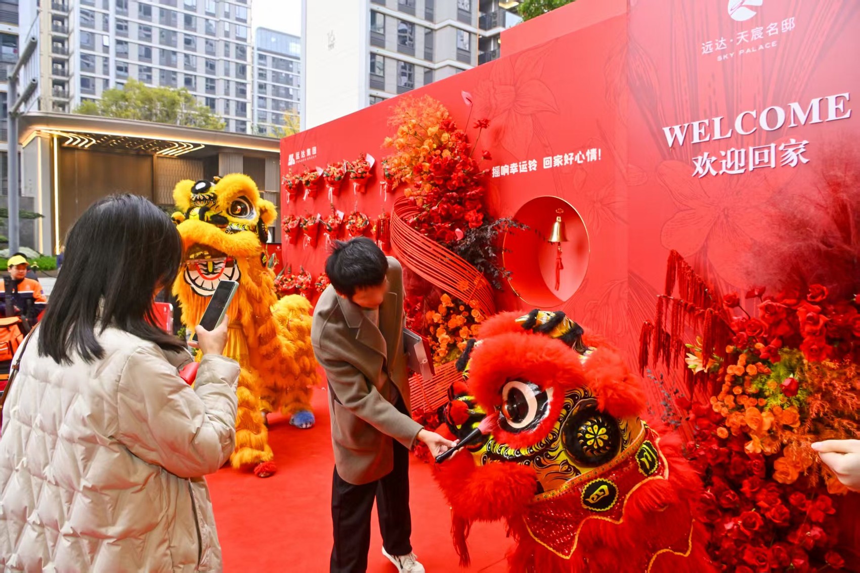 远达·天宸名邸交付活动现场,举行了蝴蝶结剪彩、狮头点睛等仪式, 将传统归家的氛围拉满, 饱含对业主生活的诚挚祝福,让业主的归属感在不经意间悄然而生。单元楼栋前的喜庆装点格外亮眼,园林景致与温馨指引标识和谐相融,并和清晰的交房流程指引一同构成美好的场景。